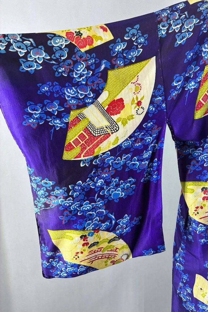 This is a gorgeous vintage 1930s silk kimono cardigan in purple with a blue floral and fans pattern. Has inner ties at the bust. In excellent condition apart from a few small runs and some light color transfer. See last two photos.