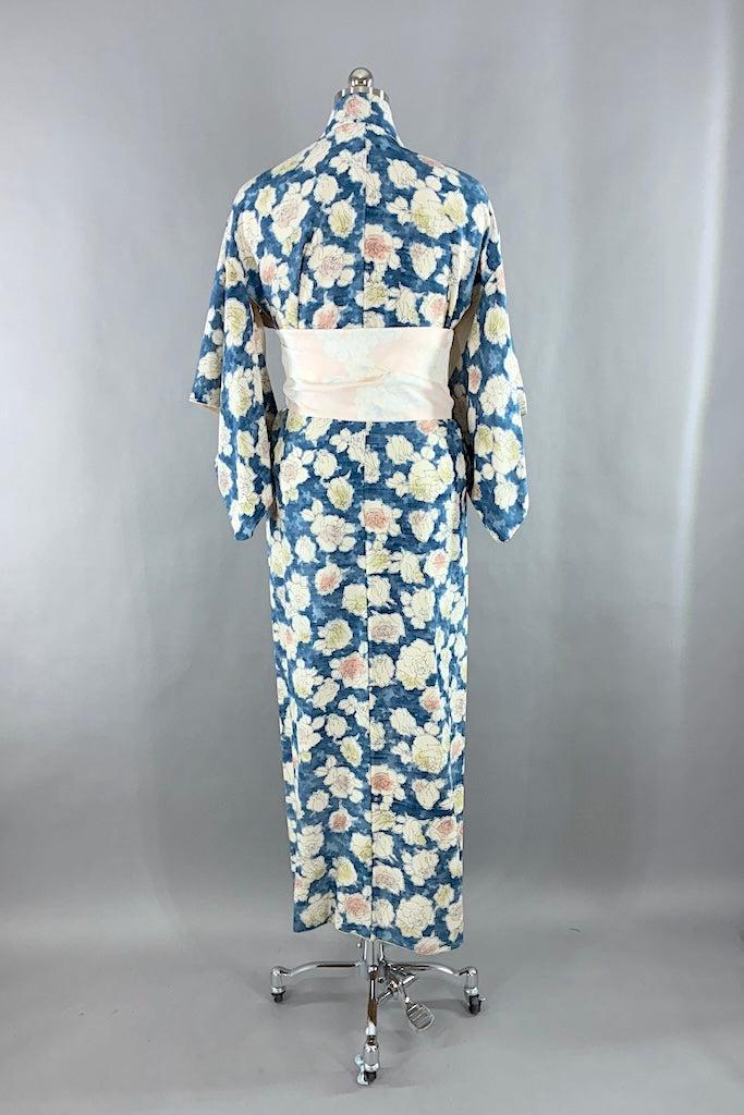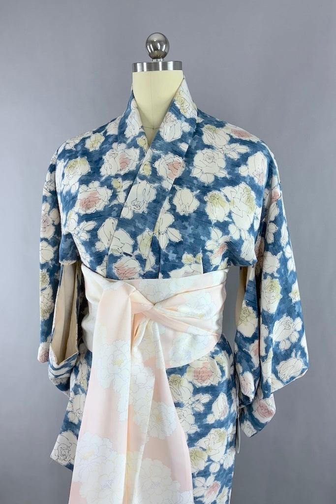 Lovely raw silk kimono in blue with a pink and green rose pattern. Fully lined. Includes handmade sash. In very good condition, a couple light marks, mainly on the lining fabric. See last photo.