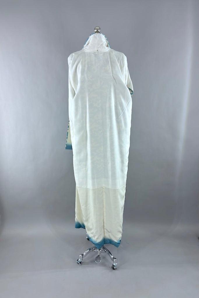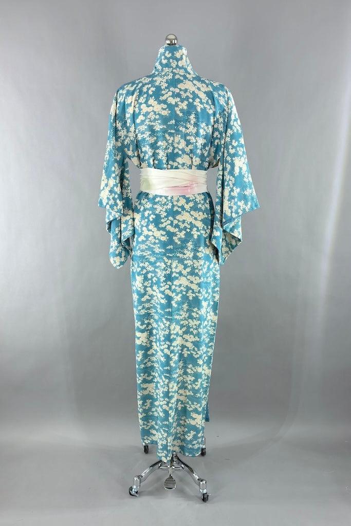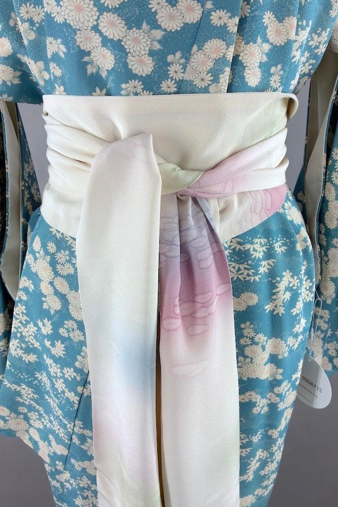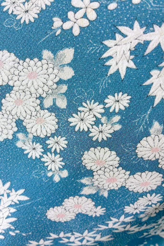 Vintage silk kimono in blue with a small white and pink daisy floral pattern. Fully lined. Includes handmade sash. In excellent condition.