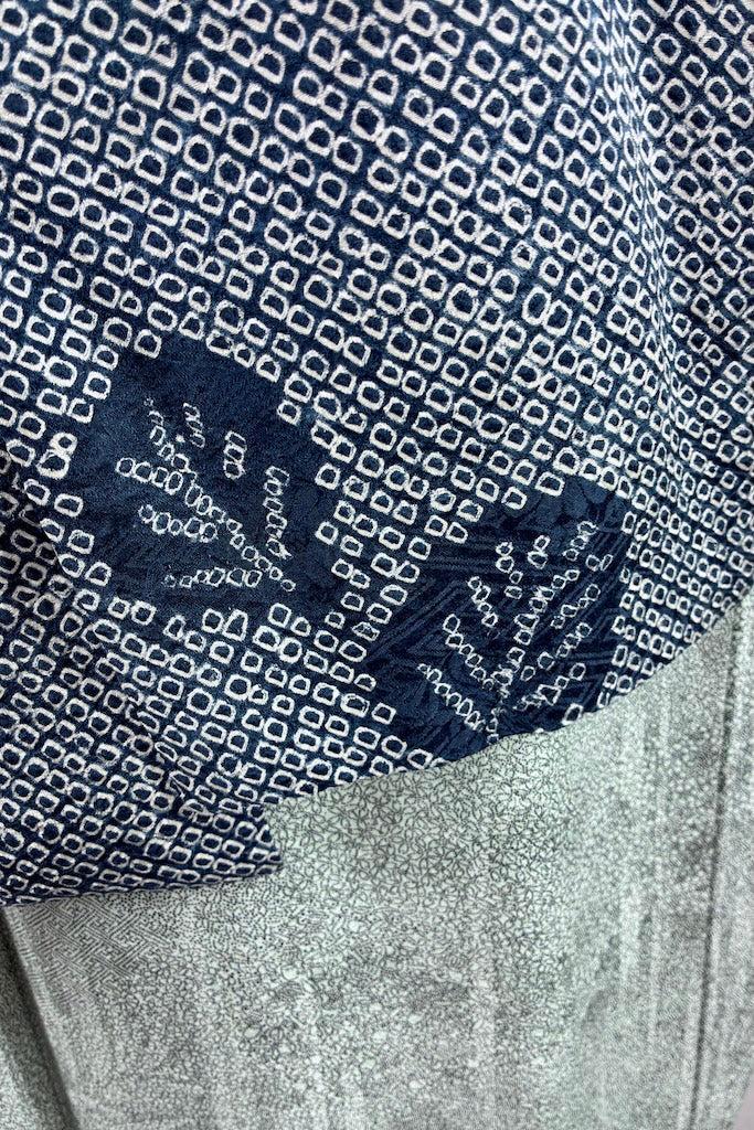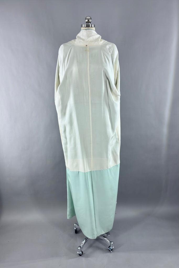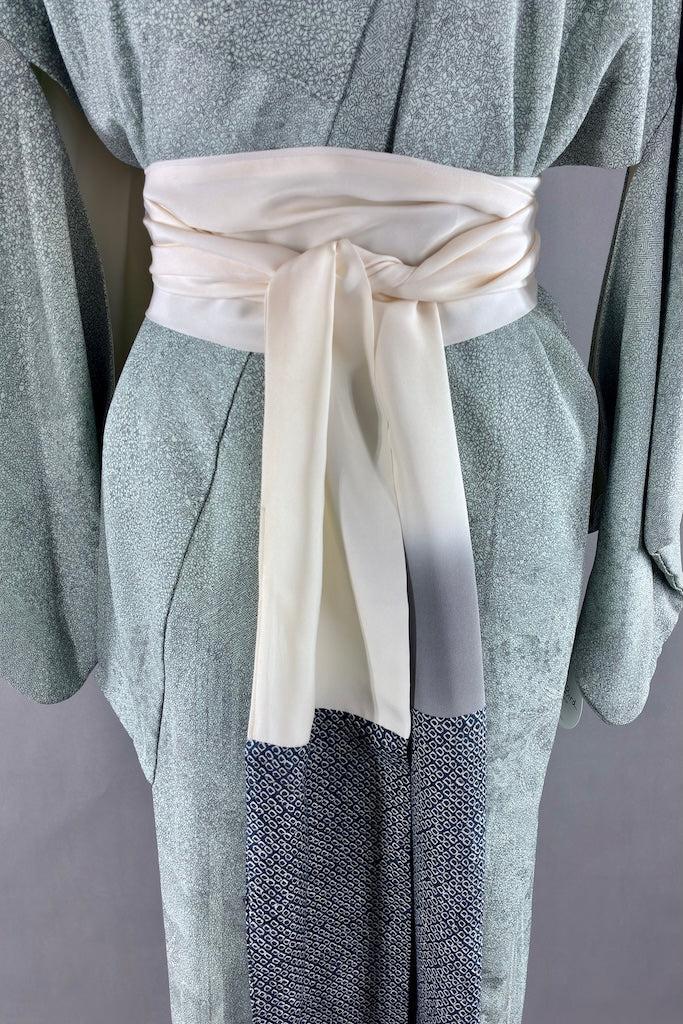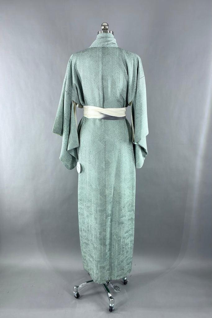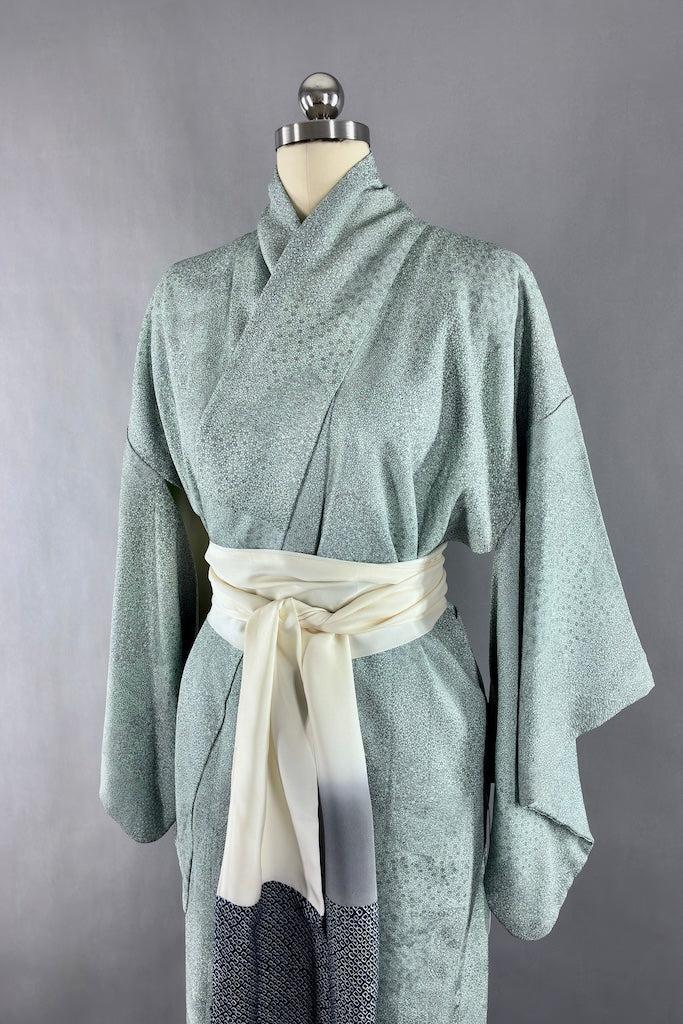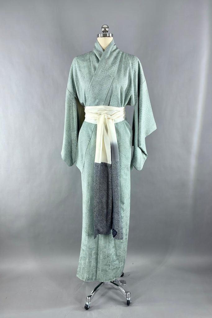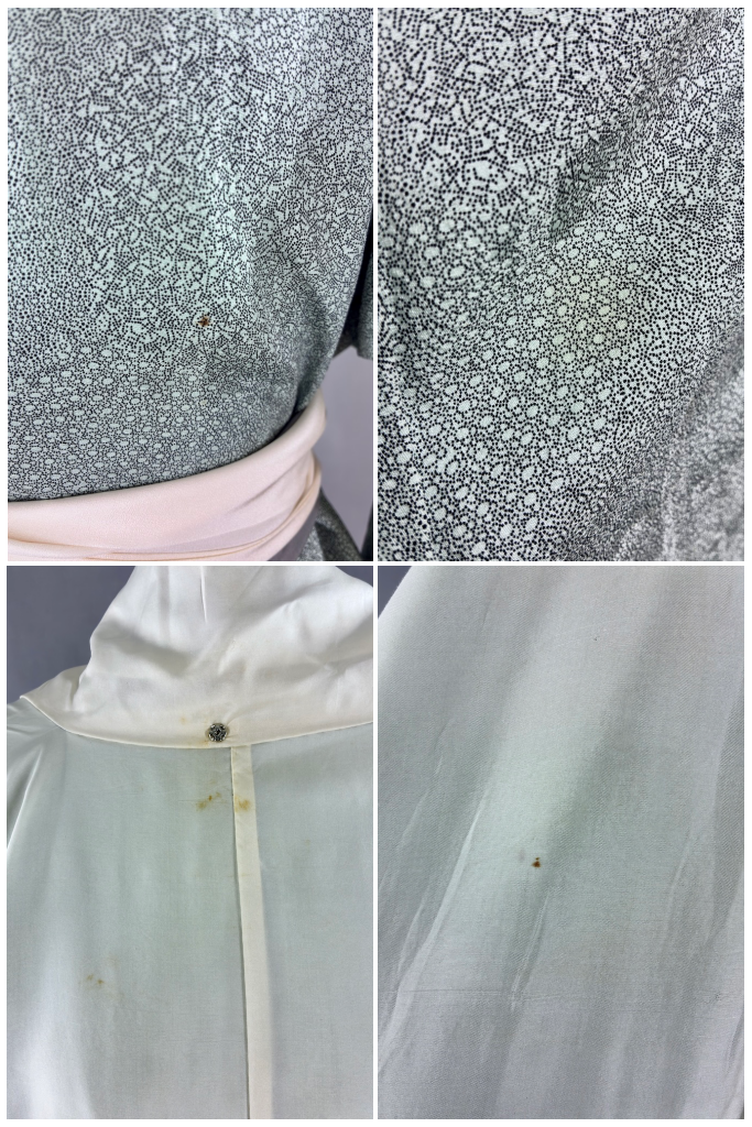 This is a vintage silk kimono in pale minty green with a tiny black dotted print. Fully lined. Includes handmade sash. In very good condition a couple light marks, see last photo.
