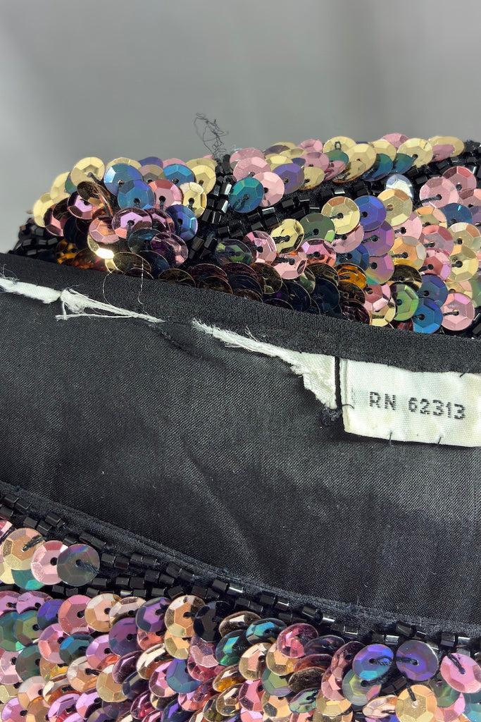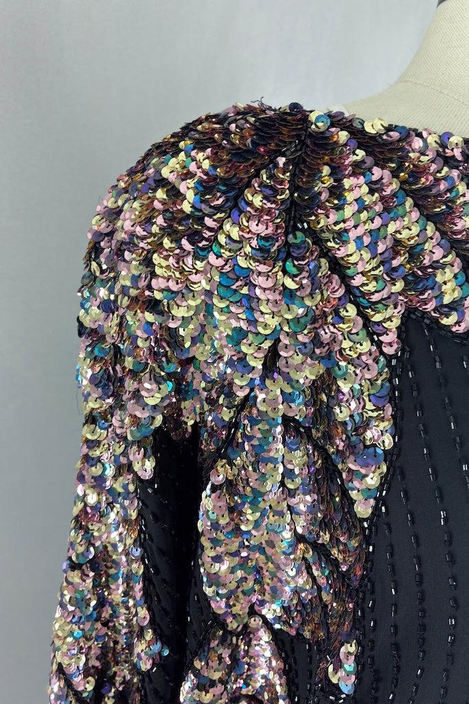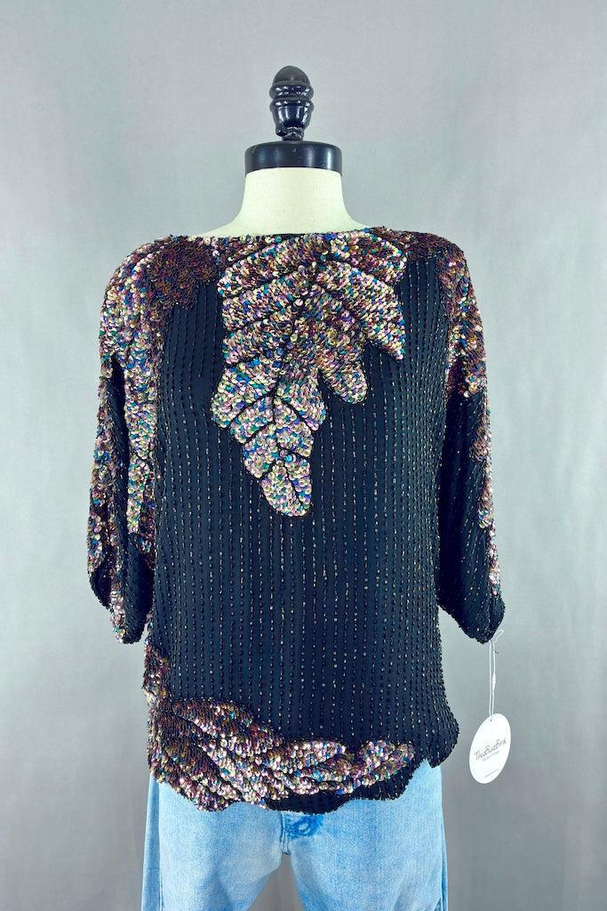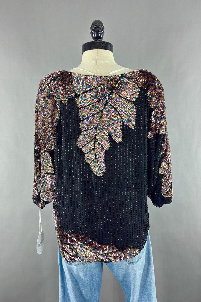 Cute vintage 80s black silk top with black beads and a pastel rainbow of sequins. Shoulder pads! Slips on over the head. Fully lined in black. Good wearable condition, there are a few loose threads and one strip of missing beads. See last photo.