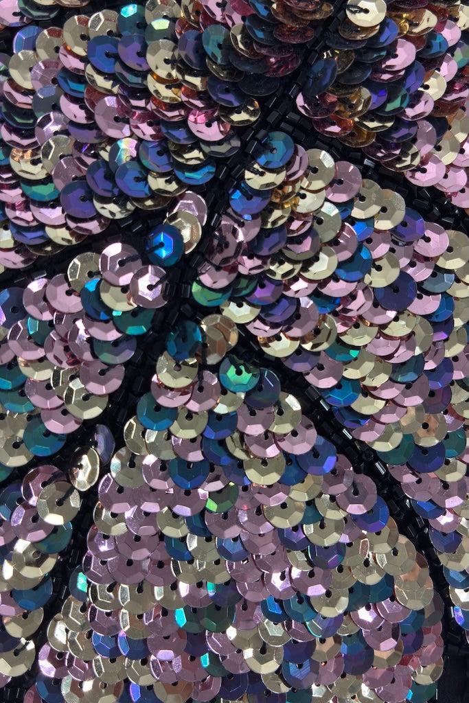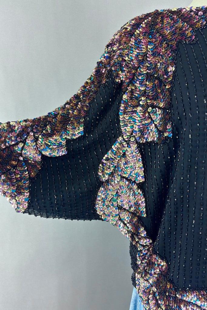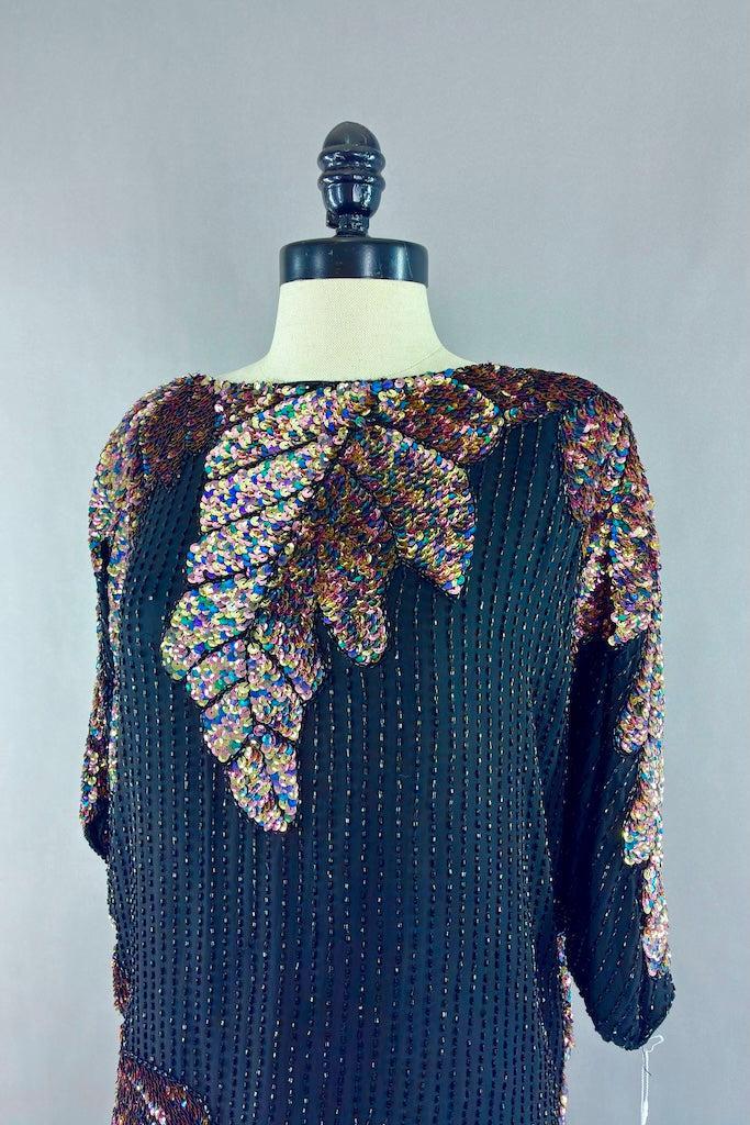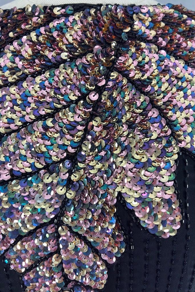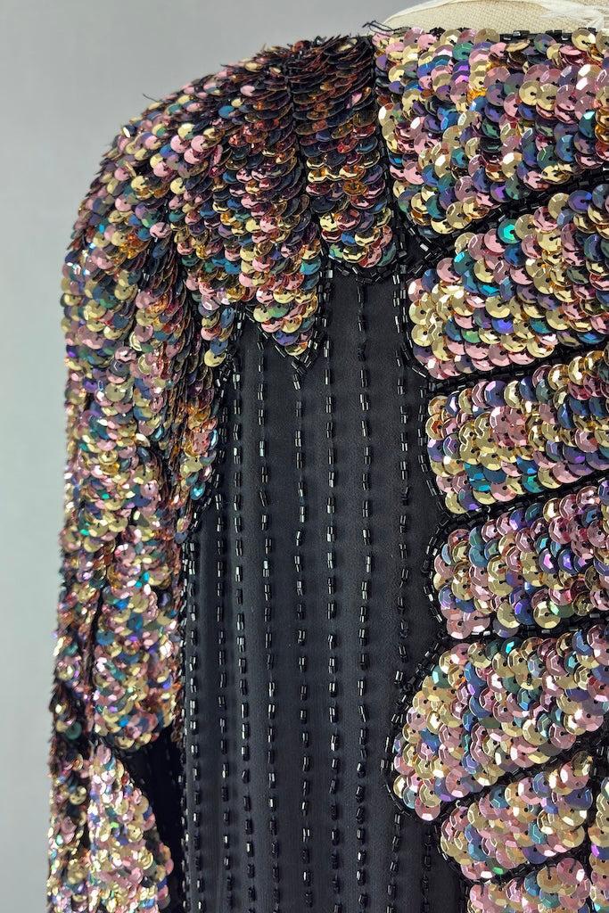 Cute vintage 80s black silk top with black beads and a pastel rainbow of sequins. Shoulder pads! Slips on over the head. Fully lined in black. Good wearable condition, there are a few loose threads and one strip of missing beads. See last photo.