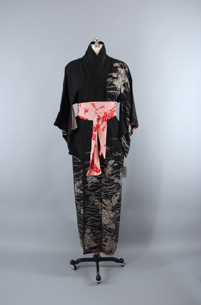 1950s Vintage Silk Kimono Robe / Black & White Floral