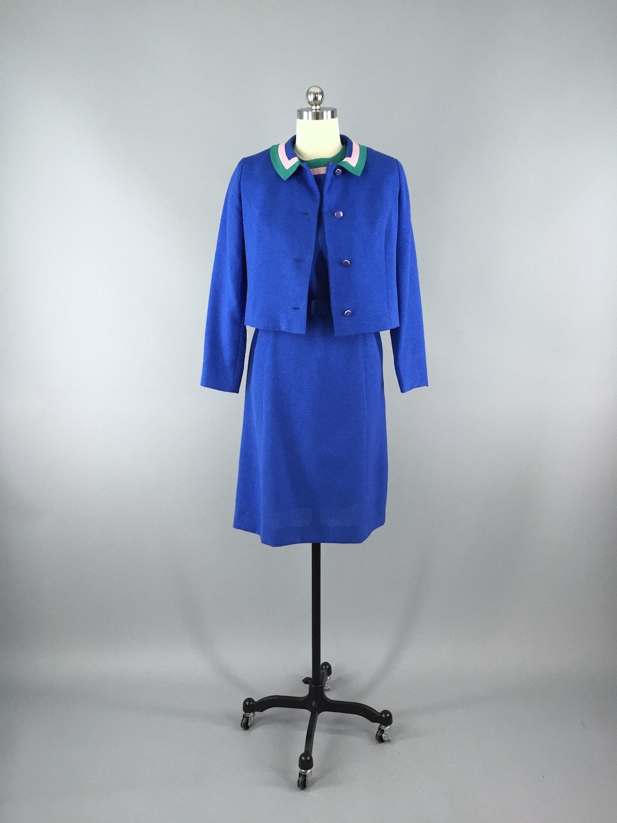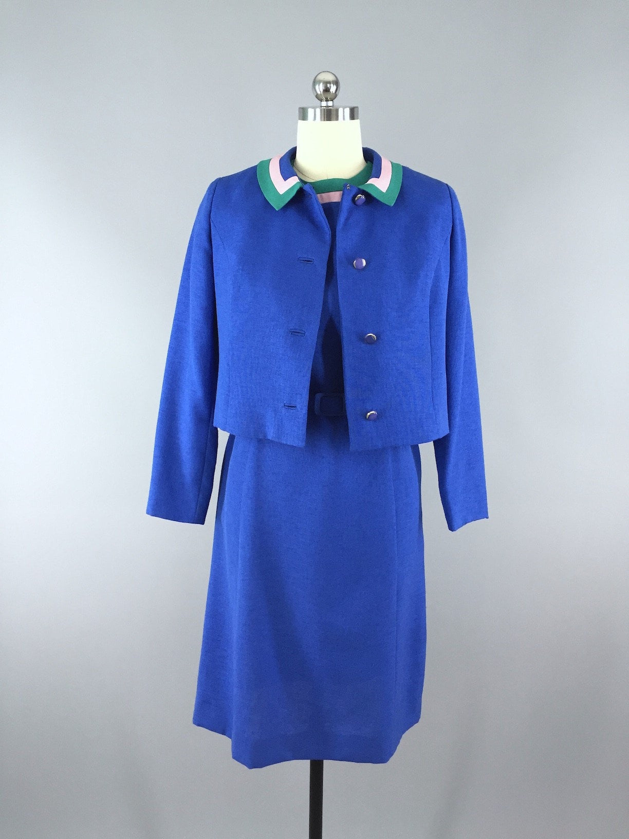 Beautiful two piece dress and jacket set with matching belt. The dress is short sleeve with pink and green trim at neckline. The jacket is cropped with matching trim at collar, as well as on the lining, with lovely blue buttons. The the dress and jacket are polyester and the jacket is lined in acetate, the belt is in matching blue polyester. All pieces are in excellent condition.