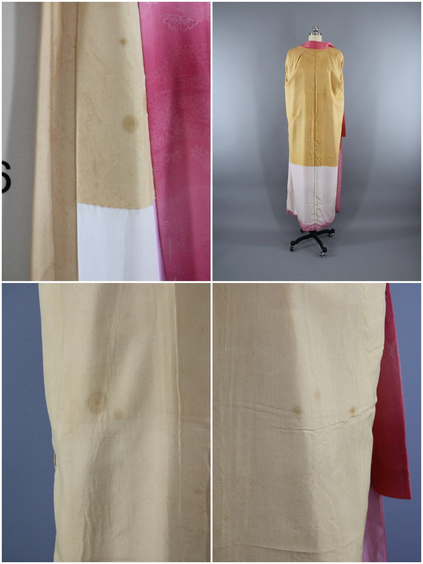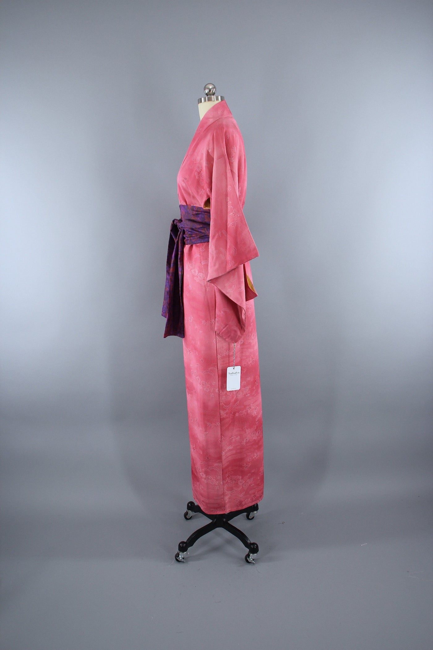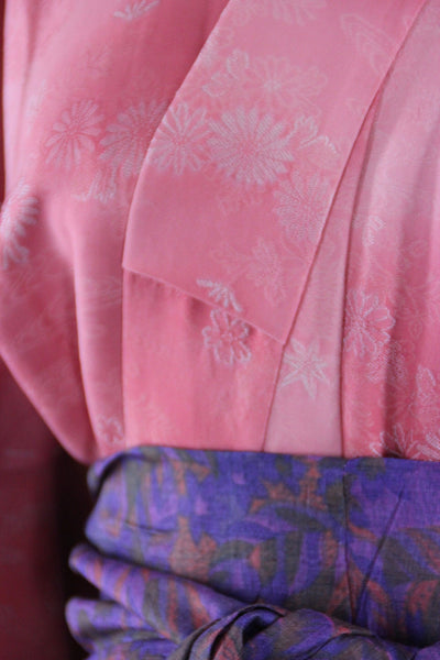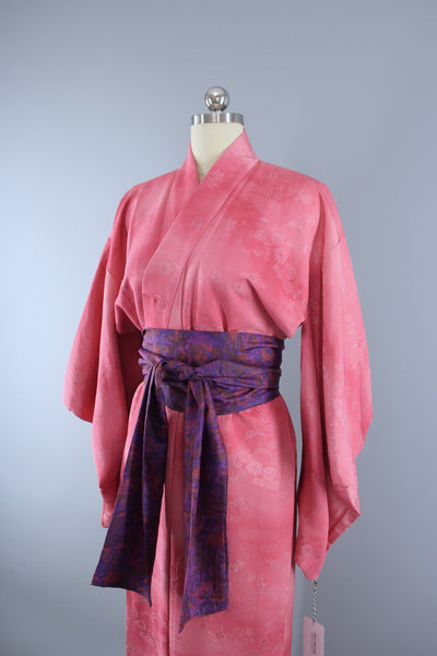 Lovely vintage 1960s silk kimono robe in pink and white floral damask. Very soft with a nice drape. Fully lined and includes a sash handmade from vintage fabric, as shown in photos. It is in excellent good condition, showing scattered spots to the lining, see last photo.