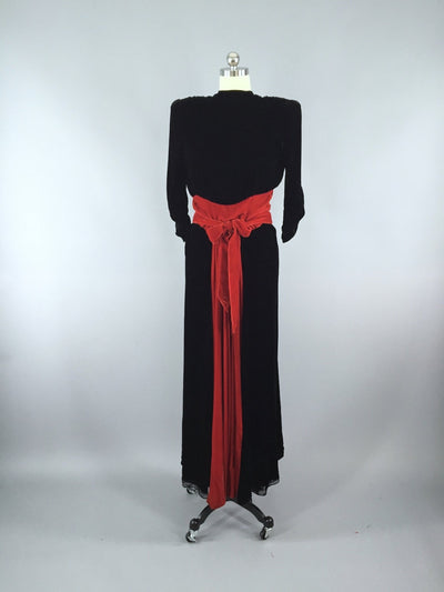 Very dramatic 1940s maxi dress in black and red velvet. High neckline in front and large shoulder pads give it a Hollywood flair. Deep v-neck back, gathered sleeves at the wrists, sash attached at each side which can be tied around the front or back, back metal zipper and snaps. Unusual to find in a larger size for the era.