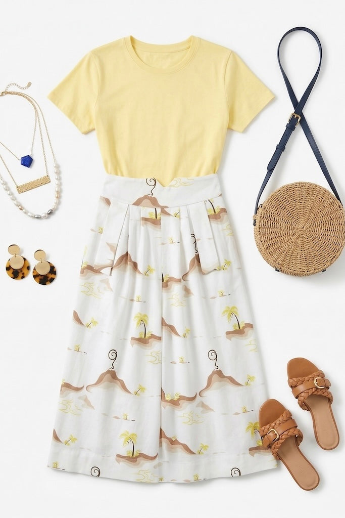 Fabulous!! Vintage 1940s midi skirt. Made of white waffle weave cotton with a Hawaiian style volcano and palm trees novelty print. Front pockets with folded cuff, side metal zipper and hook/eye clasps. Not lined. In excellent condition.