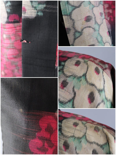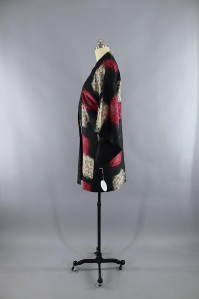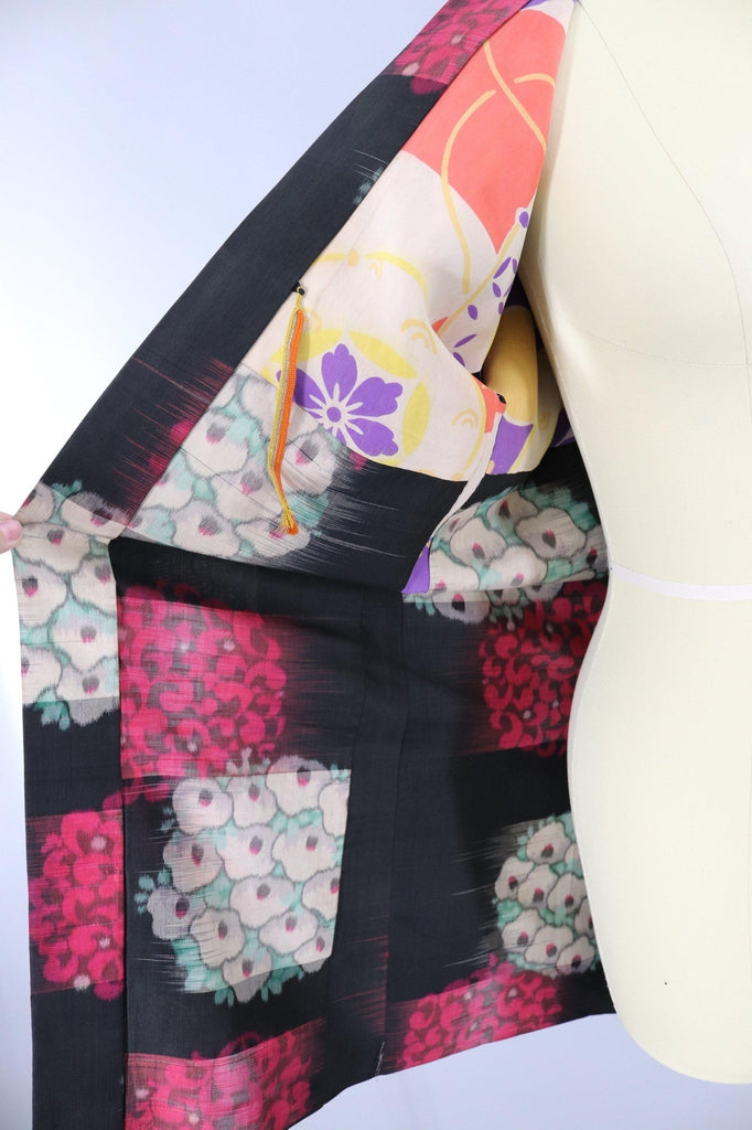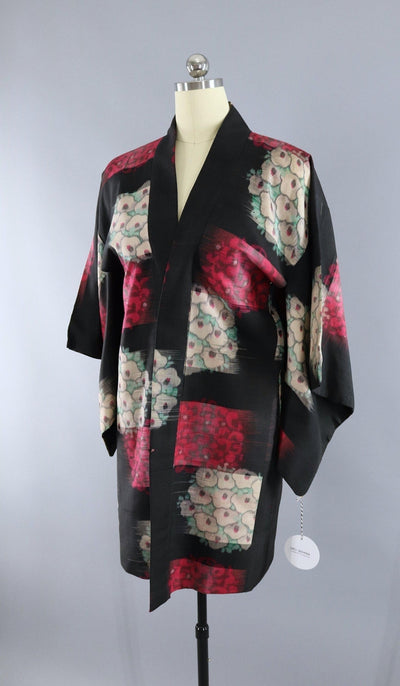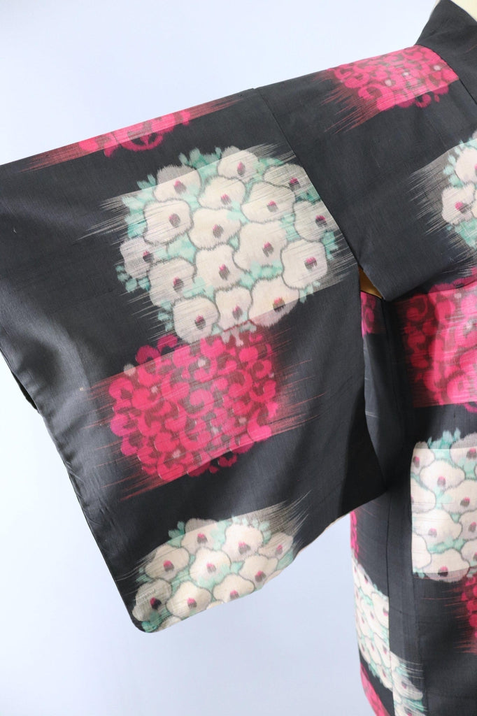 Vintage Silk Kimono Jacket / Black and Pink Floral Ikat