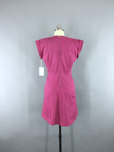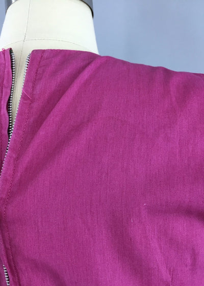 Adorable! Vintage 1950s summer dress in a purple-pink cotton with white embroidery on the bodice and pockets. Gathering at the shoulders and turned cuffs. There is a pleat in the front center and a back metal zipper. Not lined. In excellent condition apart from one very faint round watermark on the upper back, shown in last photo.