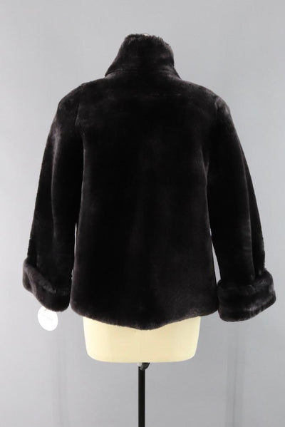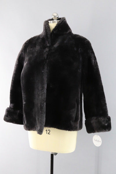 Lovely vintage 1950s silver grey sheared lamb mouton fur coat! In a very wearable modern size, Turned cuffs and lined in satin. Hook/eye at the neck, hangs open down the front. Flannel lined pockets. In excellent condition.