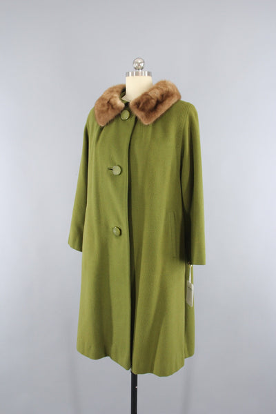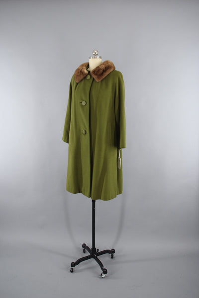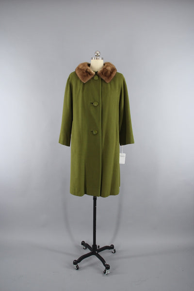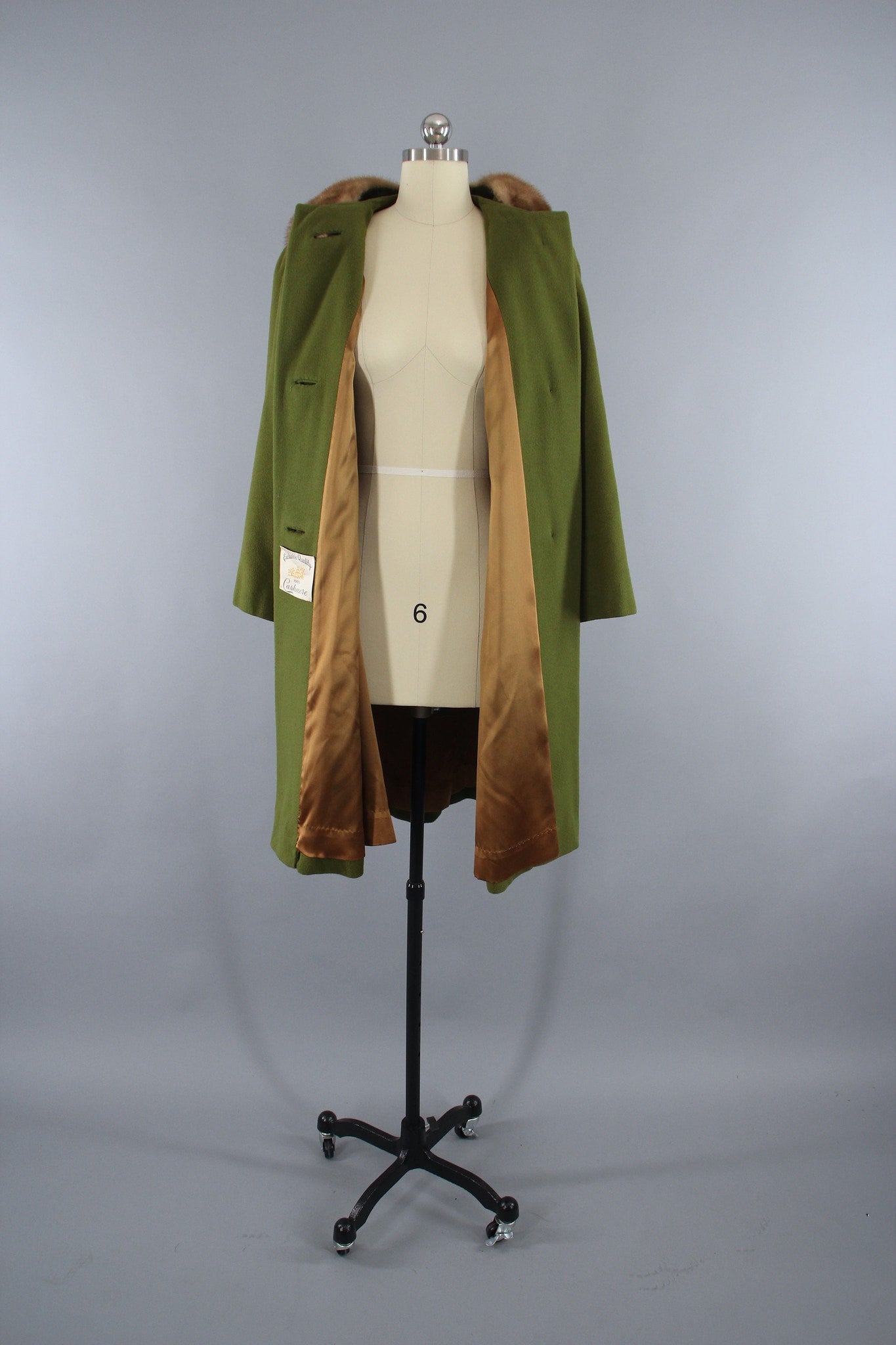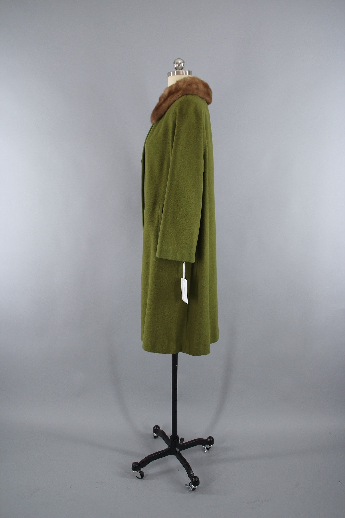 Vintage 1960s Cashmere Coat in Olive Army Green with Fur Collar
