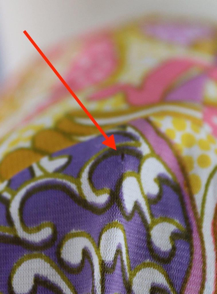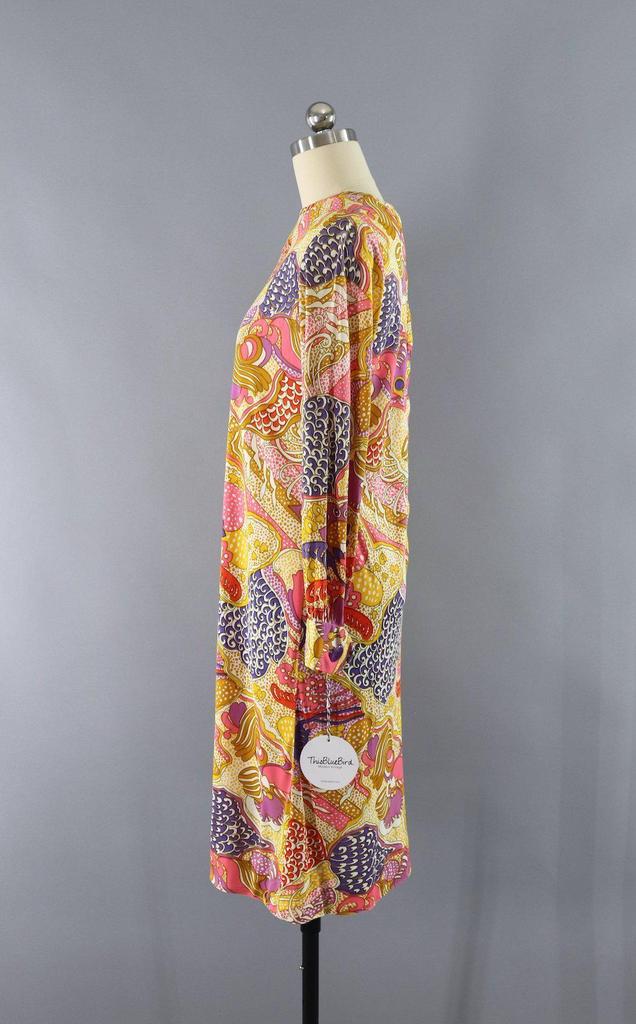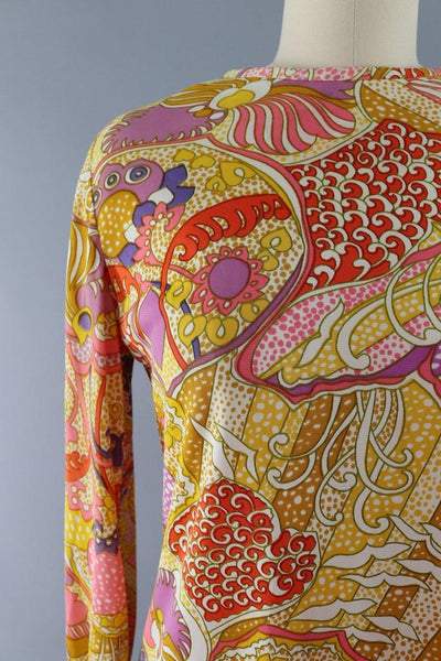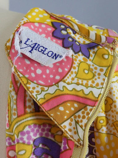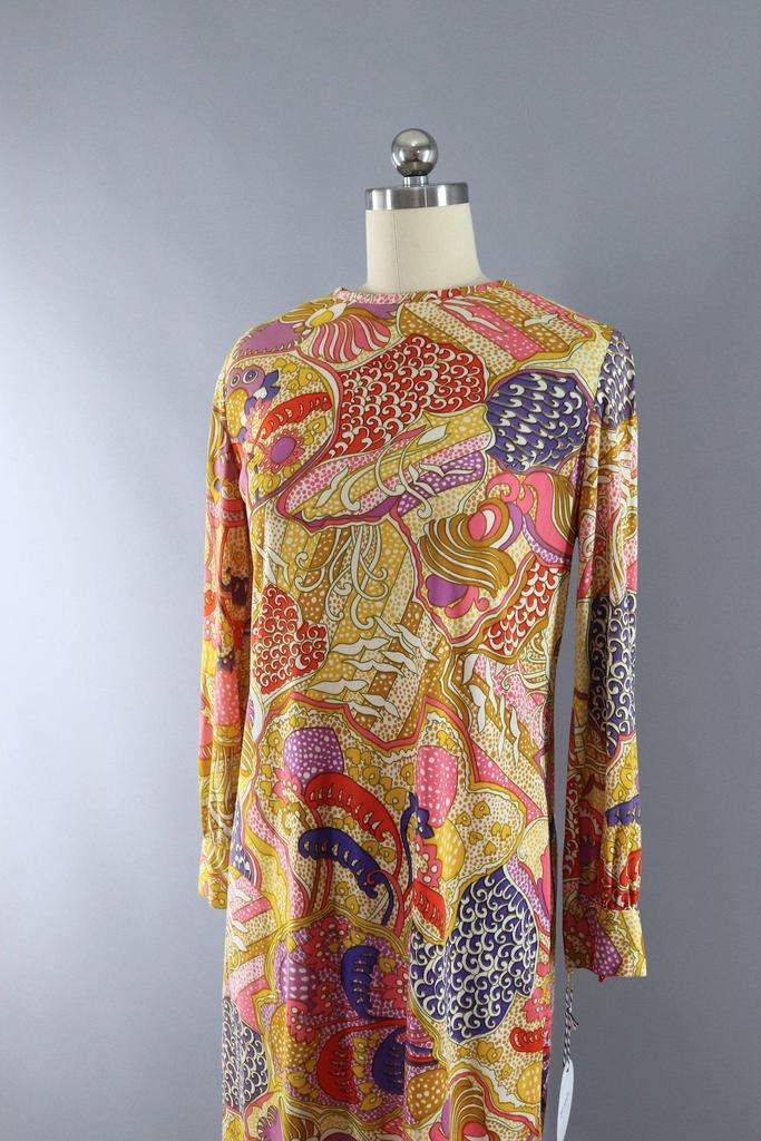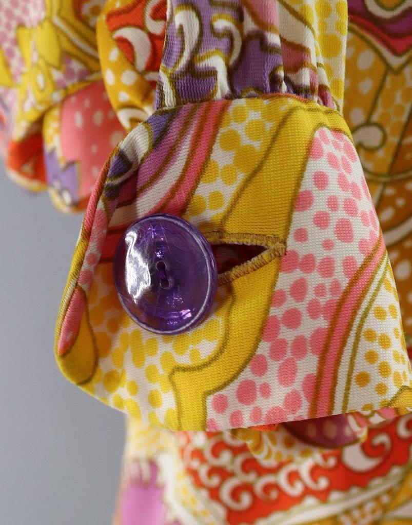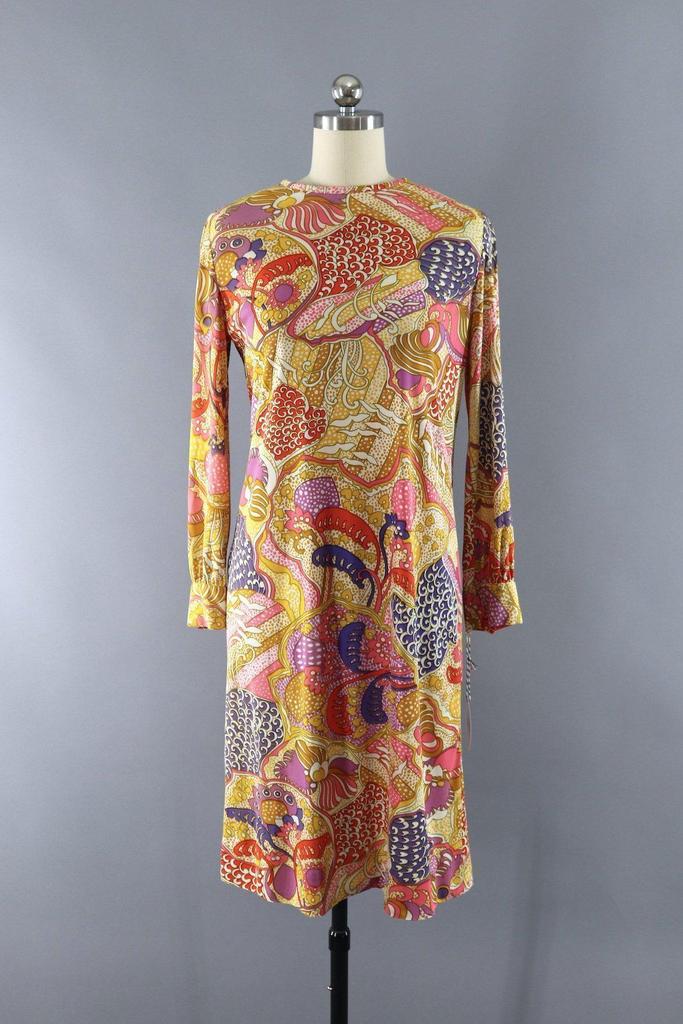 Vintage 1960s day dress in gold, orange, and pink multi color novelty print. Made of super soft polyester jersey with large purple buttoned cuffs. Not lined, has back nylon zipper. In excellent condition, one tiny pinhole, see last photo.