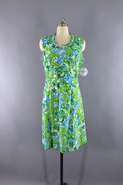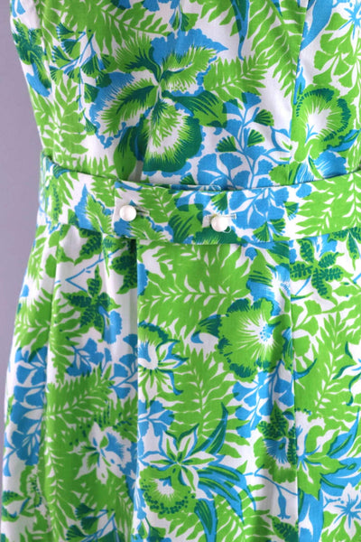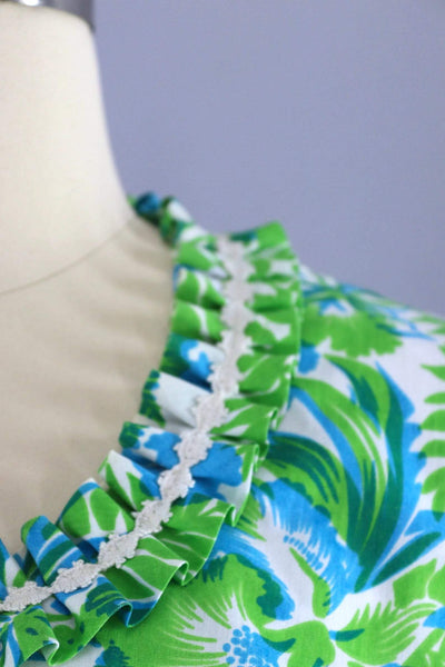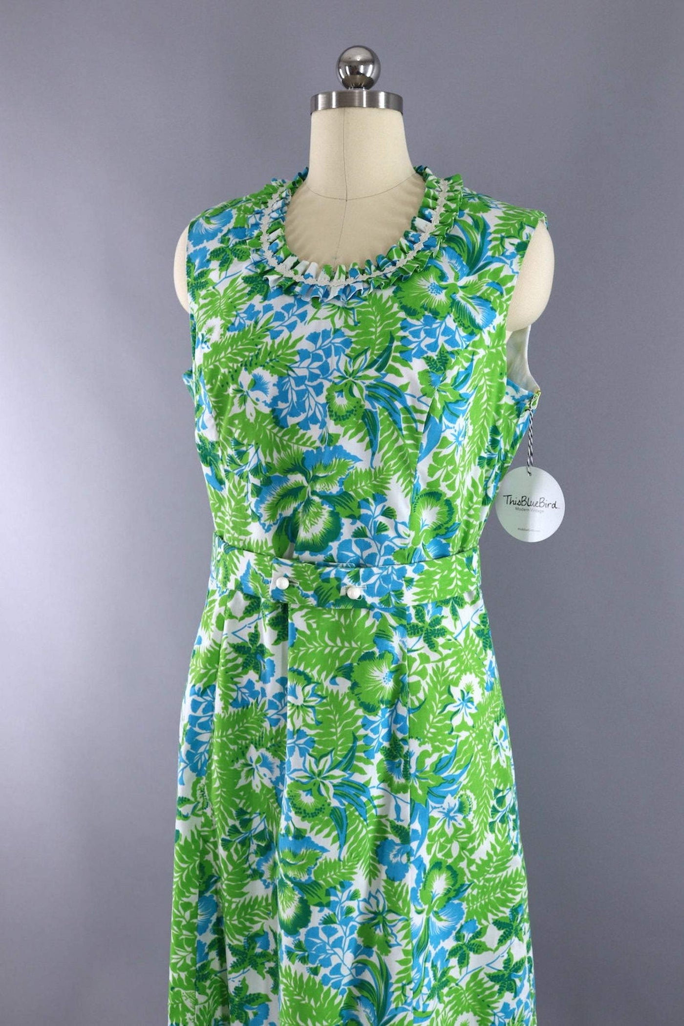 Vintage mid to late 1960s day dress by The Sporting Tailors. Preppy green and blue floral print cotton/poly blend. Ruffled neckline, matching belt. Back nylon zipper. Fully lined. Excellent condition.
