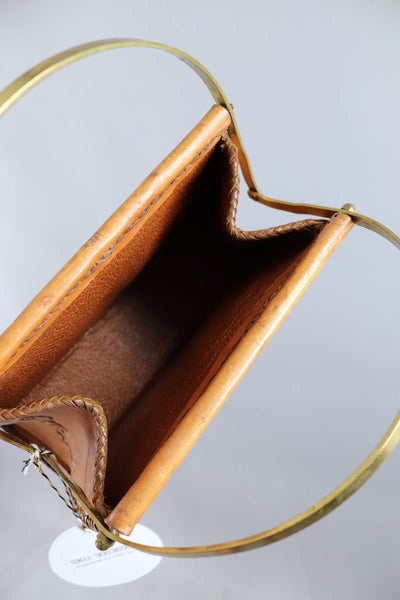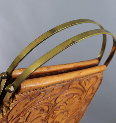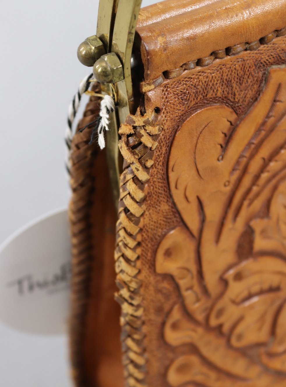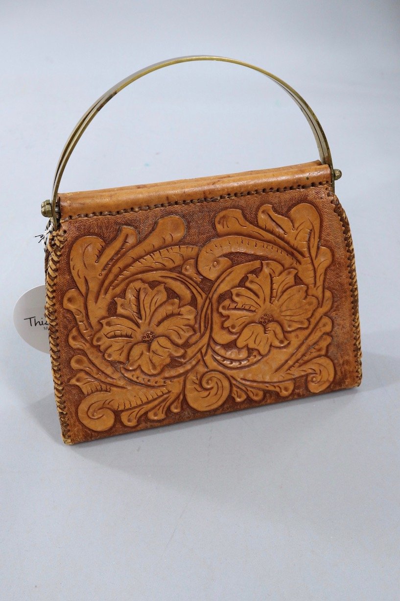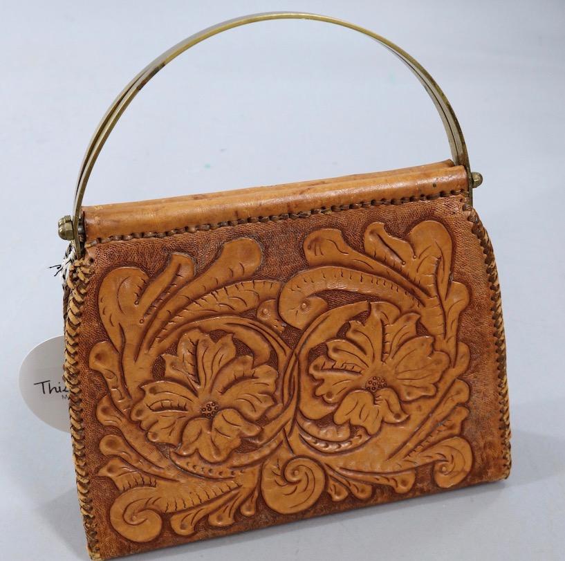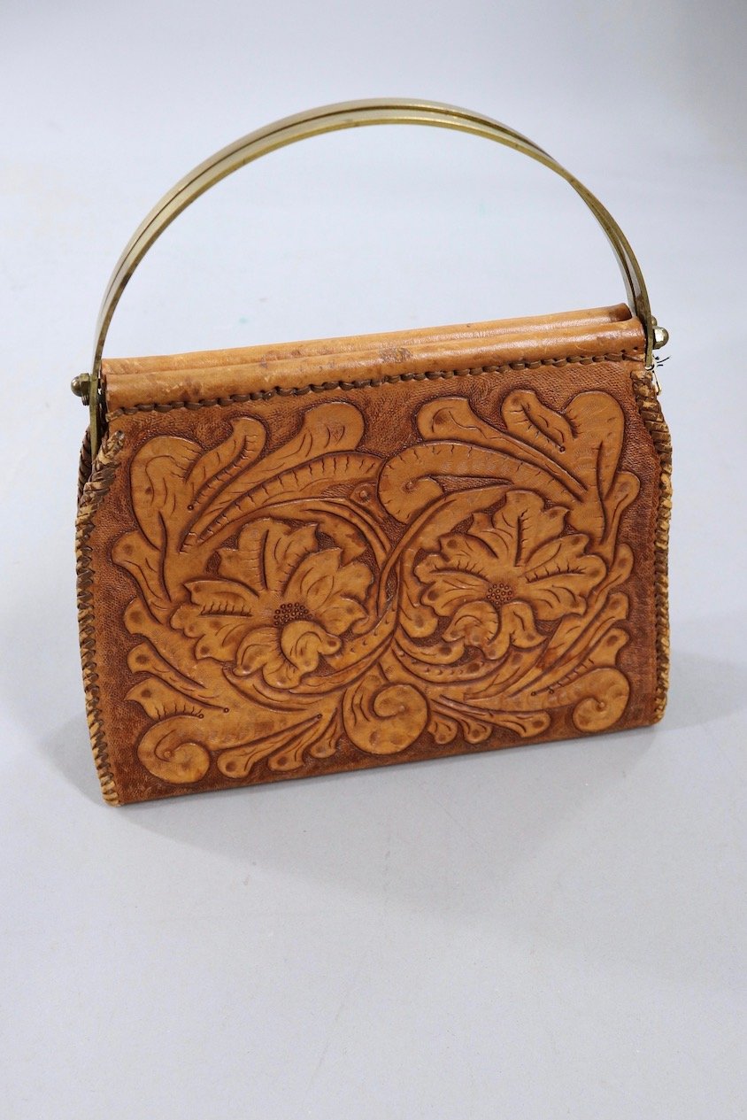 Cute vintage 1960s to 1970s tooled leather frame purse with brass tone metal handles. One side has the original owners initials. In good condition, one of the tiny brass screw caps has been replaced with a new one, there is some wear on the frame and laced edges, a few faint spots on one side. See photos.