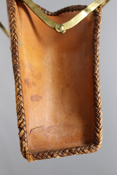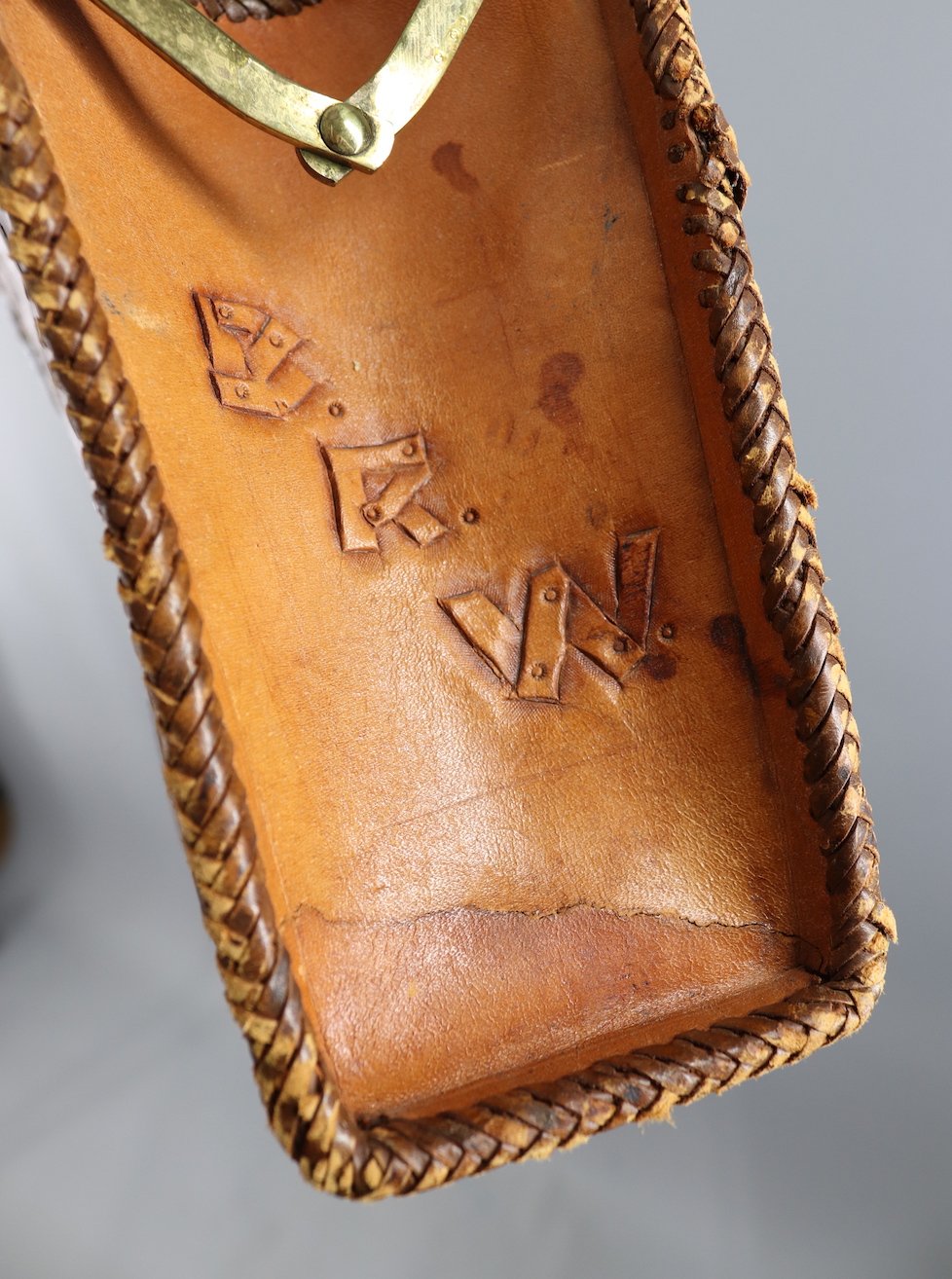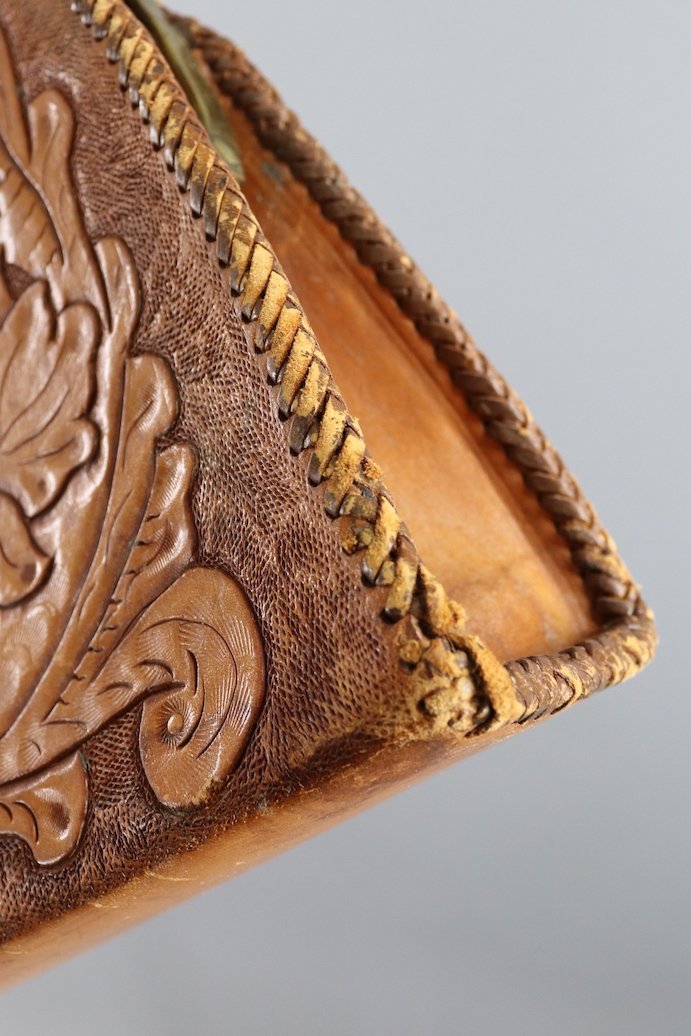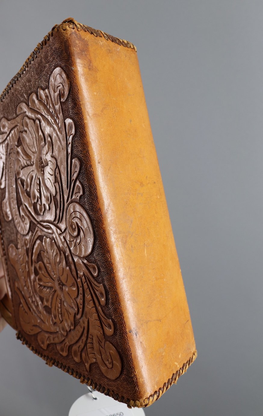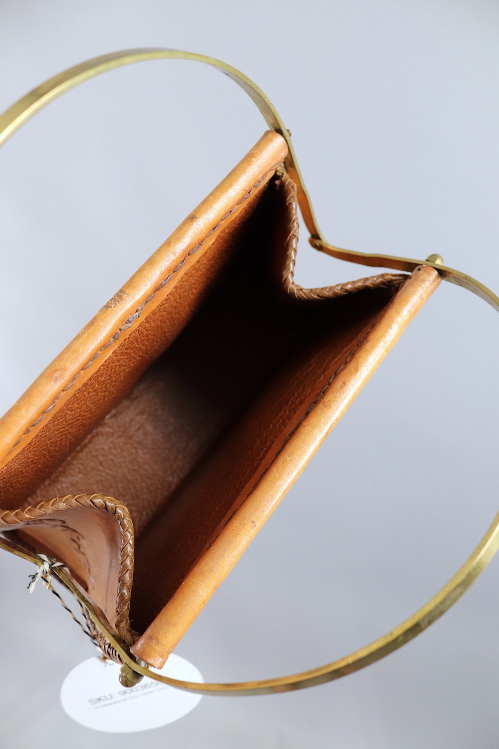 Cute vintage 1960s to 1970s tooled leather frame purse with brass tone metal handles. One side has the original owners initials. In good condition, one of the tiny brass screw caps has been replaced with a new one, there is some wear on the frame and laced edges, a few faint spots on one side. See photos.