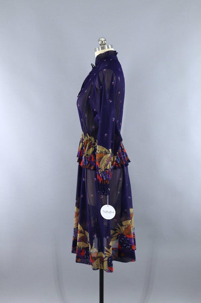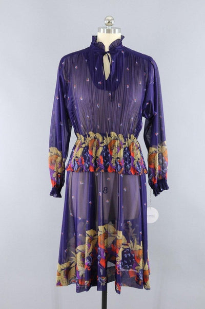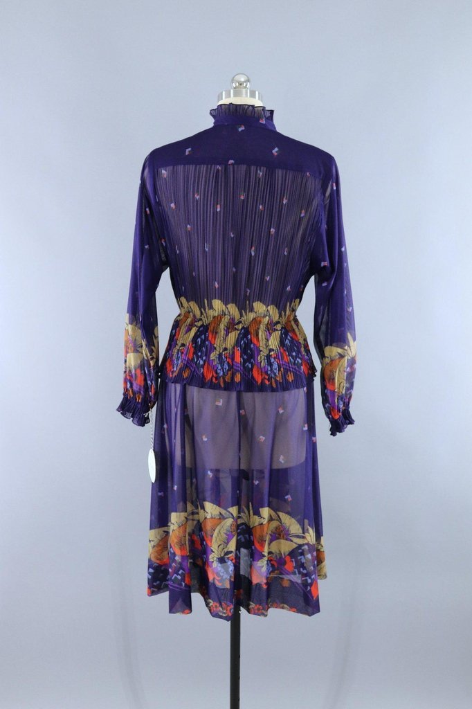 Vintage 1980s peplum day dress in dark purple polyester chiffon with a floral print and light accordion pleating on the bodice. This is a very dark purple, and the most accurate color is shown in the side and tag views. Fully sheer, this will require a slip. Elastic waist band, slips on over the head.