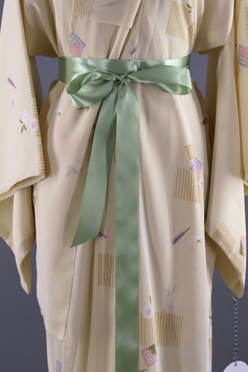 Vintage 1980s Silk Kimono Robe / Pale Ivory Yellow Pastel