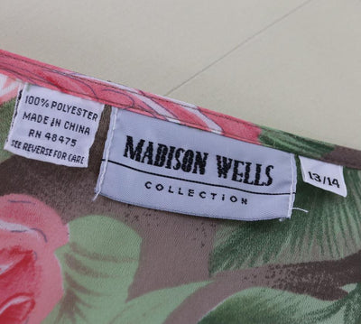 Made by Madison Wells Collection. Tag size 14 but runs a bit small in the shoulders and arms. Please refer to the garment measurements listed below, taken while laying flat and doubled where appropriate.
