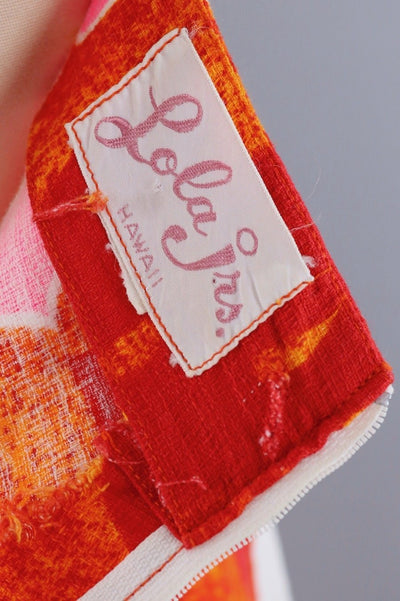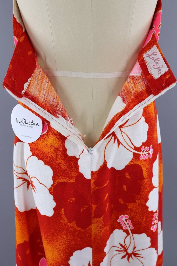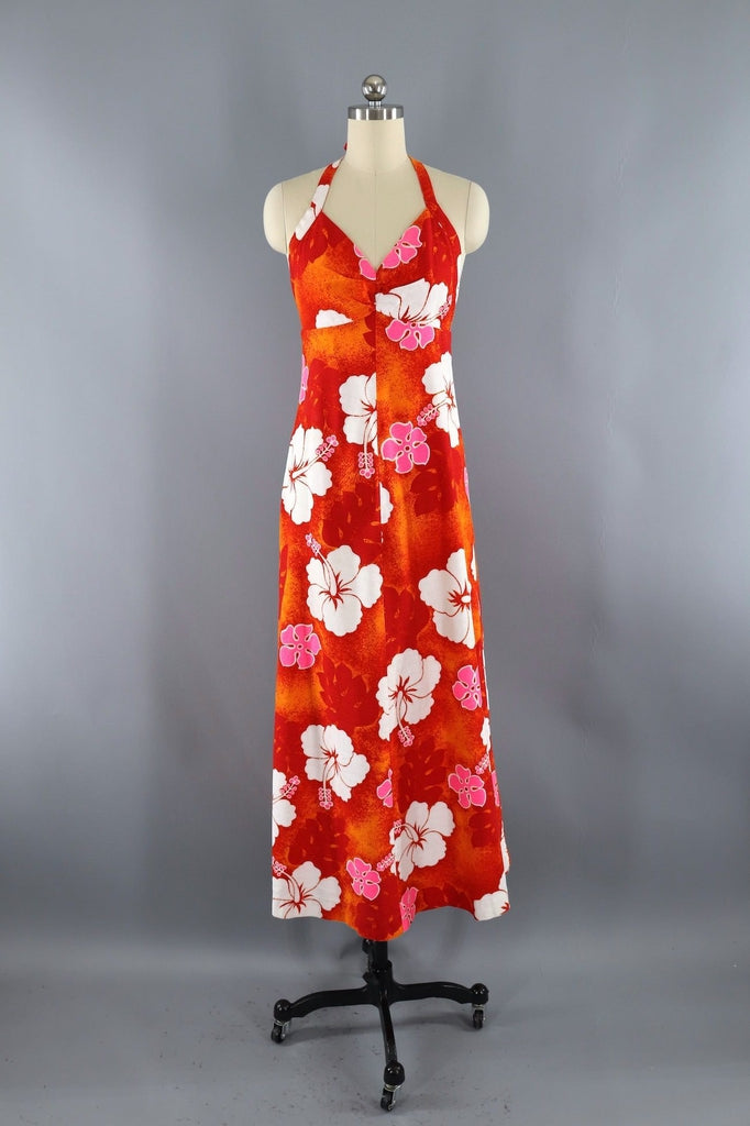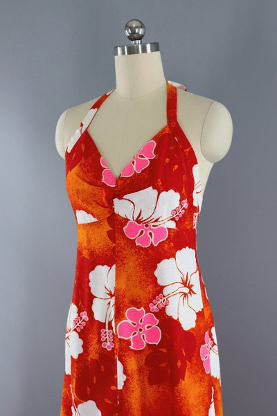 Vintage 1960s halter maxi dress in bright orange and white Hawaiian floral print barkcloth. Ties at the neck, back nylon zipper, a-line shape. Not lined. Excellent condition.