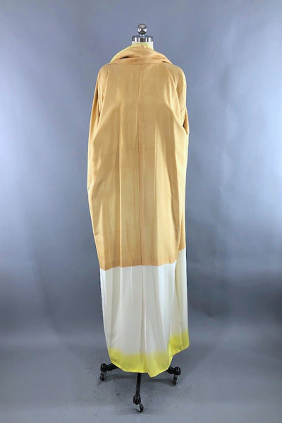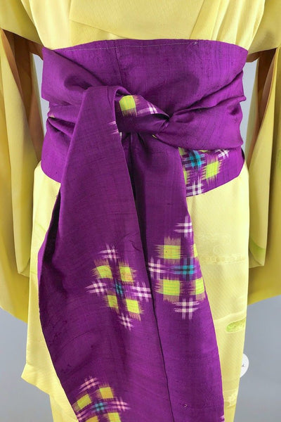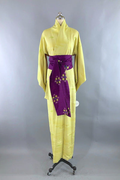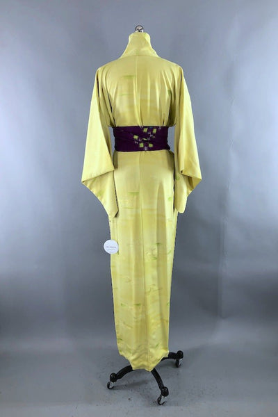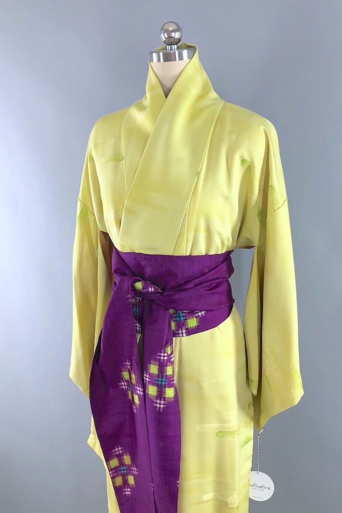 Vintage 1960s silk kimono robe in a bright acid yellow green. Fully lined. Includes the handmade silk sash shown. In excellent condition apart from a couple small spots and some spots on the lining, see last photo.
