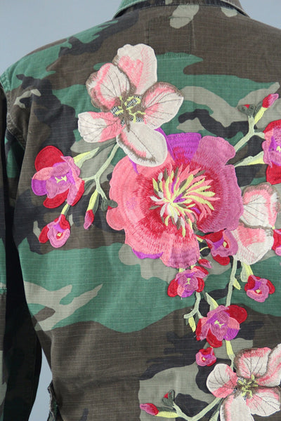 Vintage Army Camouflage Military Jacket with Large Peach Pink Floral Embroidery