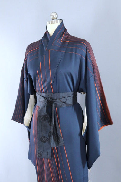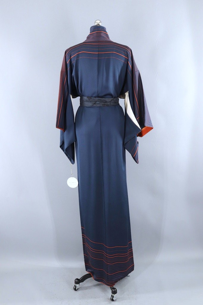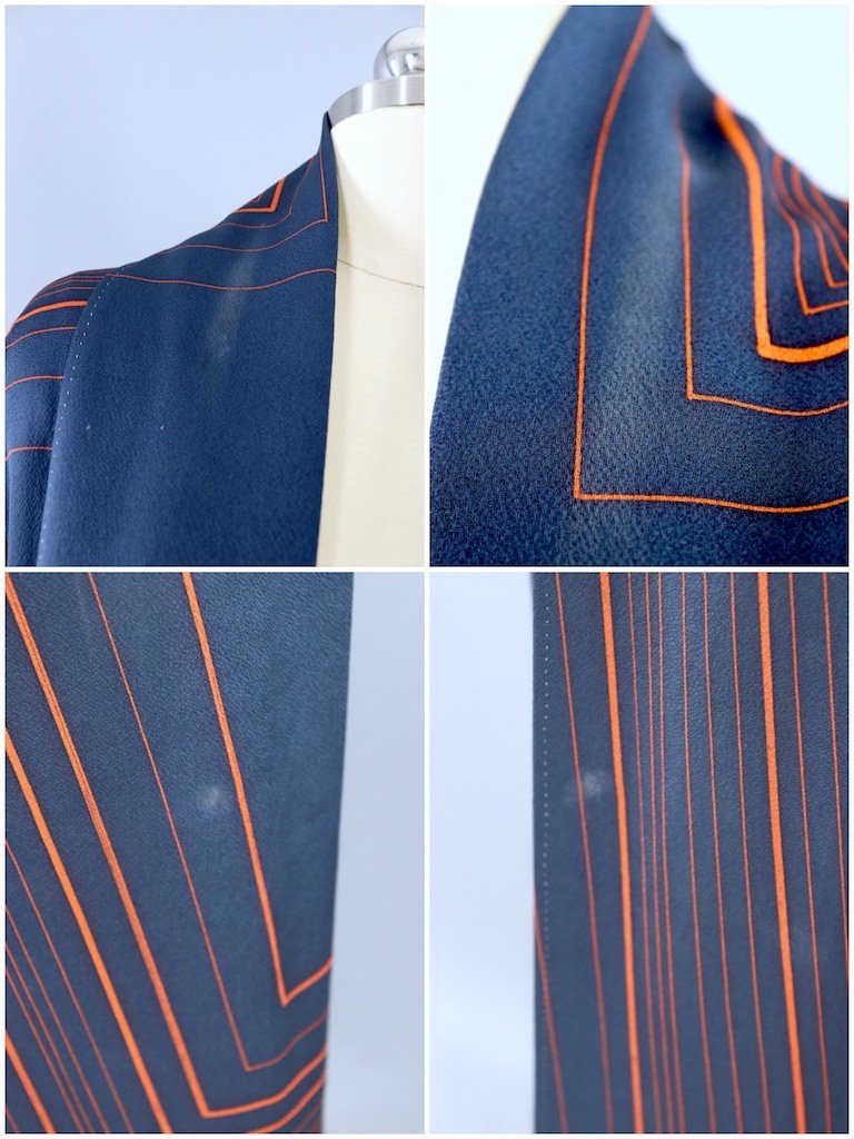 Vintage 70s kimono robe in dark blue with an orange striped print. Fully lined and includes a handmade sash as shown. In very good condition, a couple light spots and slight fading along the collar, see last photo.