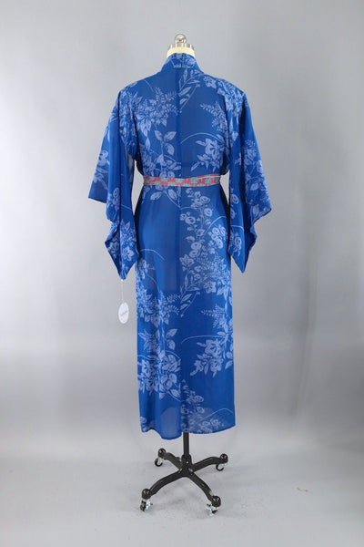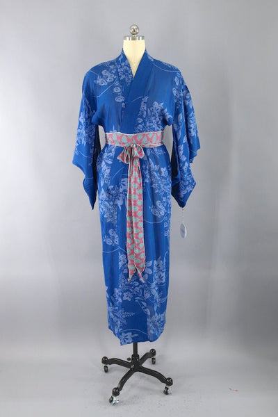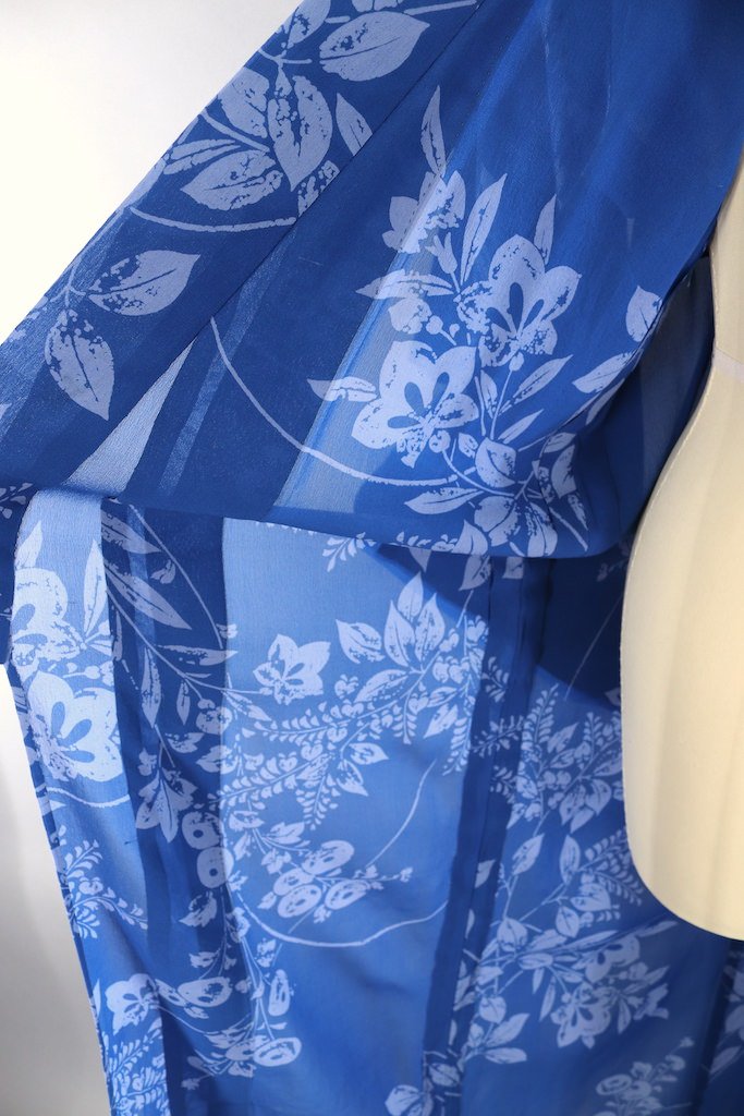 Vintage two tone blue floral print silk georgette kimono robe. Super light, it is not lined and semi-sheer. Includes a simple fabric sash. In very good condition and very wearable, there are a few light marks, see last photo.