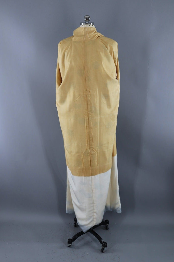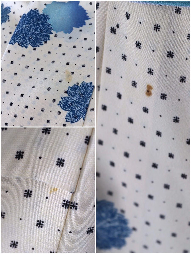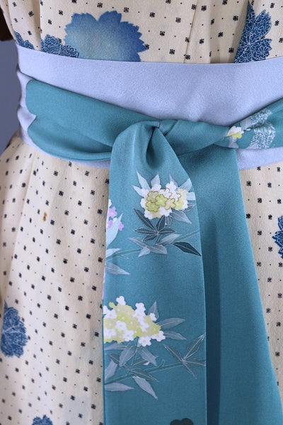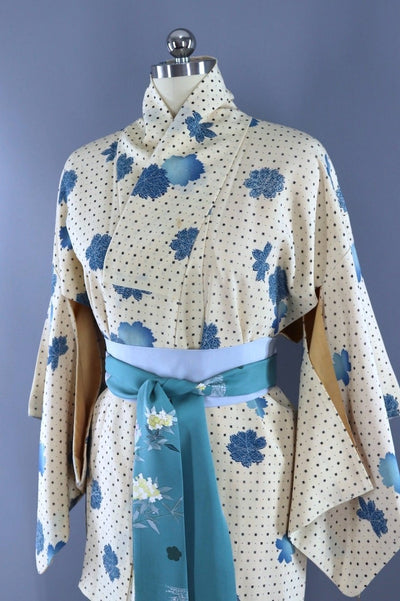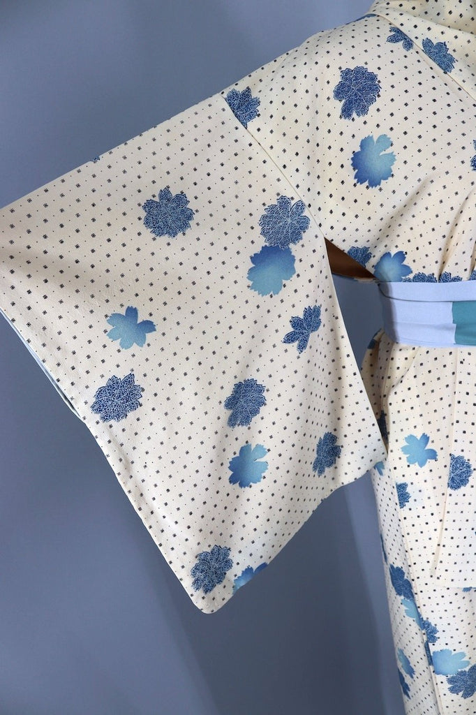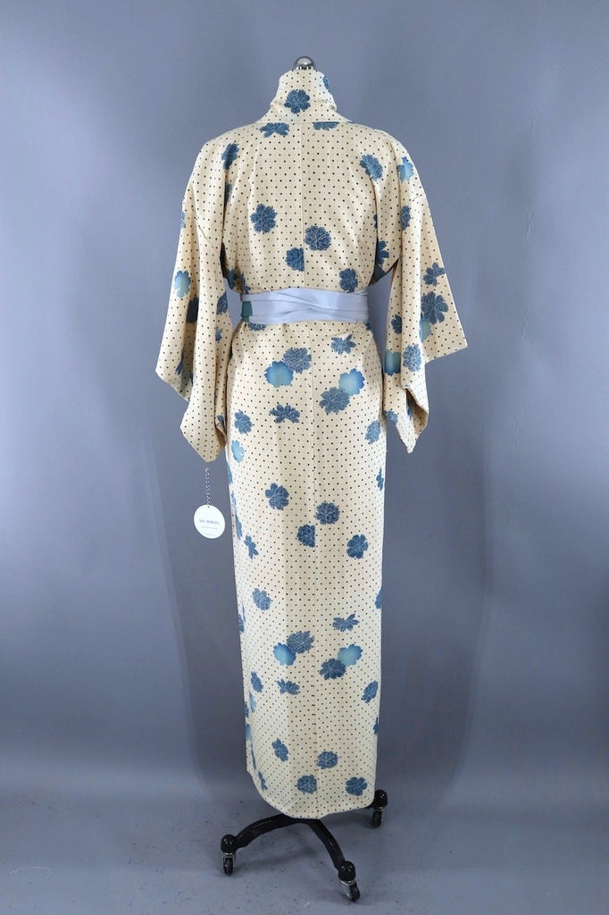Vintage silk kimono robe from the 1950s to early 60s in ivory with a blue floral print. Fully lined and includes a handmade silk sash. In excellent condition, showing a few scattered spots, see last photo.