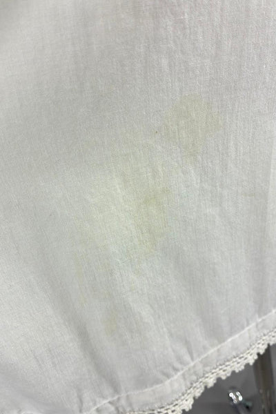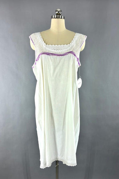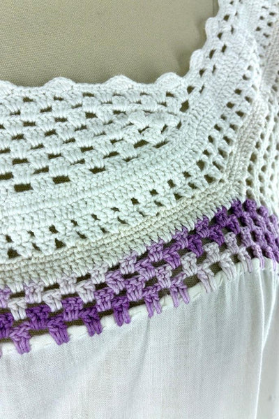 Vintage 1980s cotton dress with white, very light ecru, and purple ombre crochet trim at the neck and white crochet at the hem. A-line fit. Not lined. Very light weight cotton. Very good condition, there is a very faint mark on the back side, see photo.