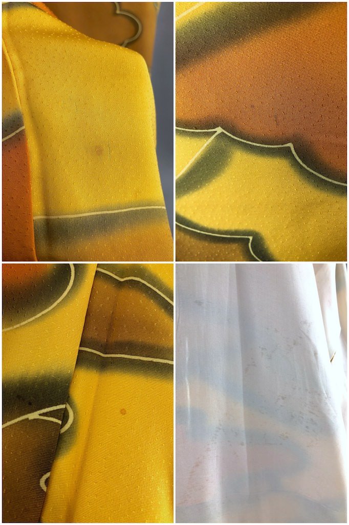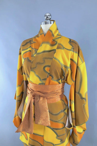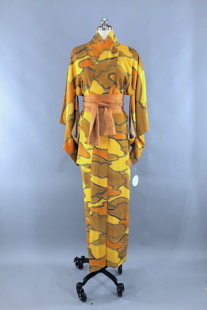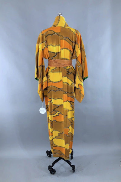 Vintage 1960s silk kimono robe in gold, mustard, and green cloud print. Fully lined. Includes the handmade silk sash shown. In excellent condition apart from some tiny scattered marks, see last photo.