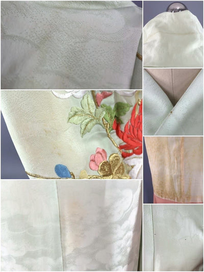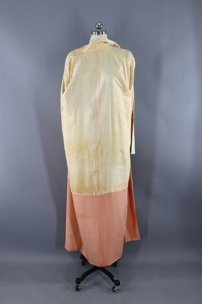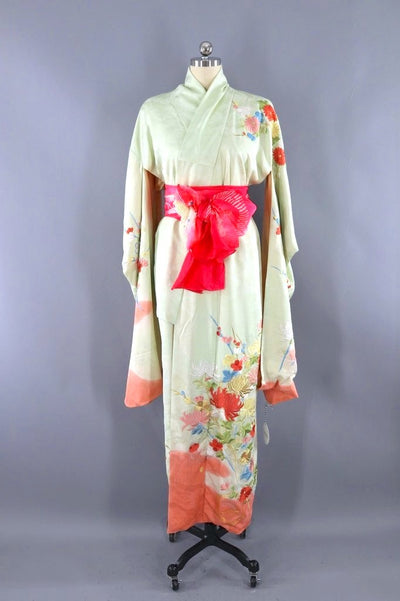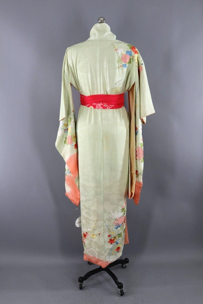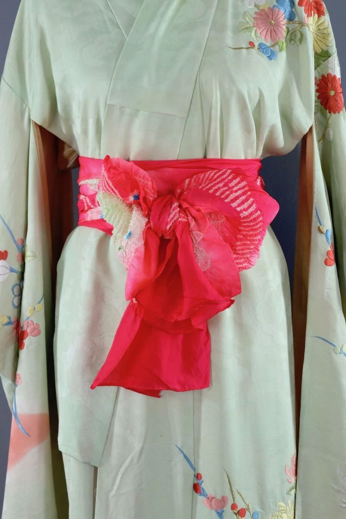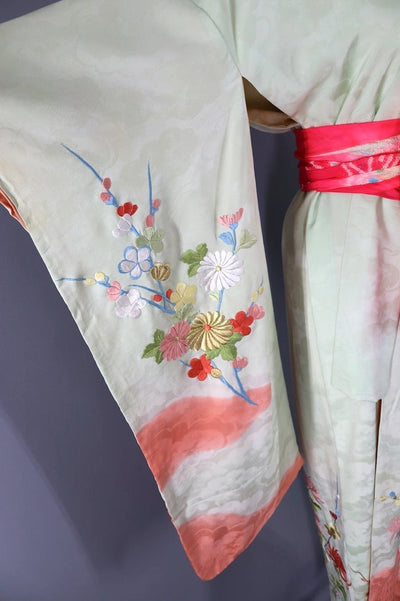Lovely vintage silk kimono robe in pastel green and coral pink with extensively embroidered chrysanthemum flowers. Fully lined and includes a long vintage silk obiage sash. In very good to excellent condition, there are a some scattered spots. See last photo.