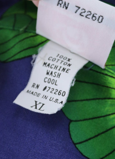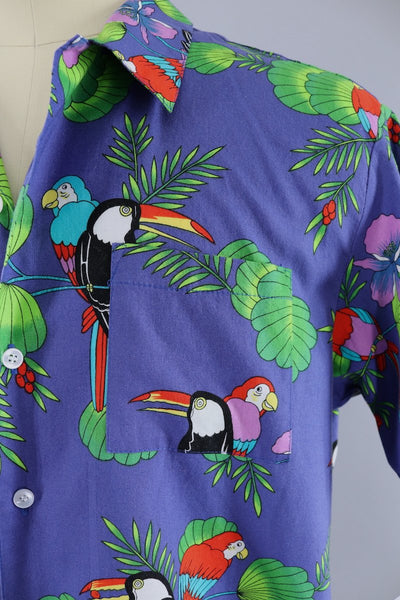 Vintage Hawaiian shirt in a blue purple with toucan birds and palm trees print. Button front with pocket. Excellent condition.