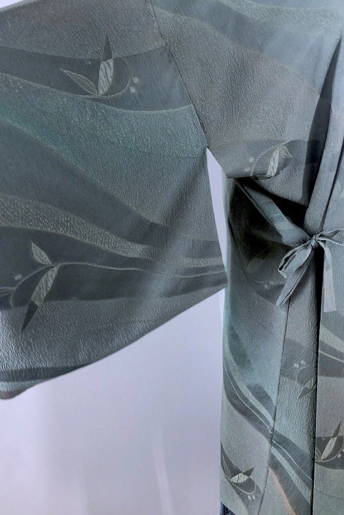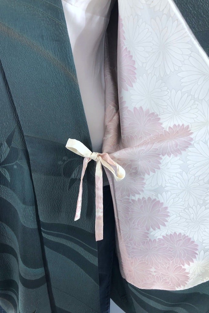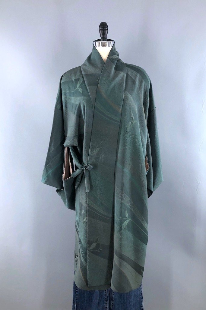 Vintage silk kimono wrap jacket in heather green with a woven wave pattern. This is called a dochougi kimono. It ties on the inner and out sides. Long enough to be worn as a cardigan, light jacket, or even a robe. In excellent condition.