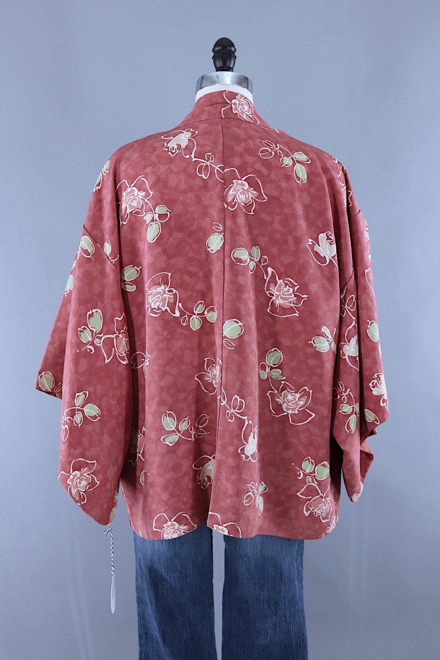Silk kimono cardigan jacket from the 1950s in a dusty pink rose floral print. Rare leather ties at the bust. In excellent condition.