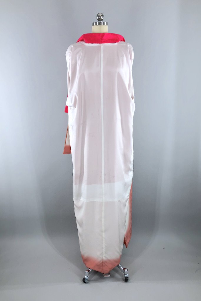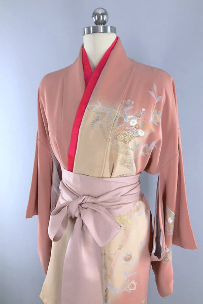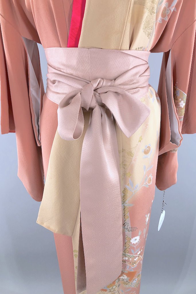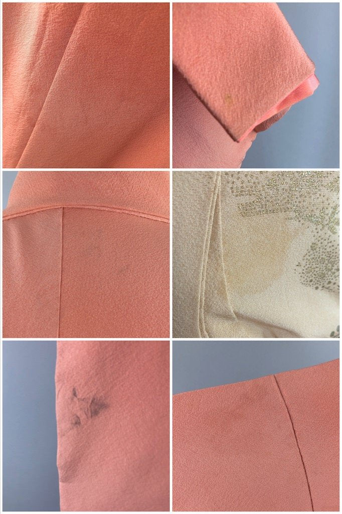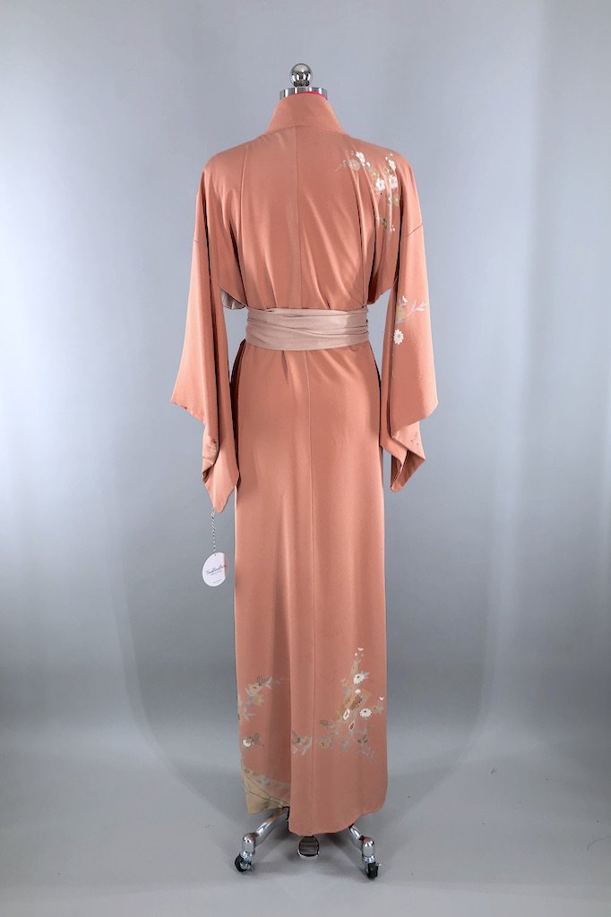 Vintage 1970s silk kimono robe in salmon pink with a blue and gold floral fan pattern. It has a hot pink silk lapel lightly tacked into the collar. This lapel is worn with the collar folded under. It can be easily removed, or should be tightly sewn in if you wish to leave it as is. Fully lined and includes a handmade silk sash. In very good condition, some scattered watermarks and a few spots. See last photo.