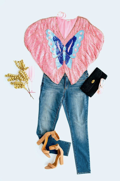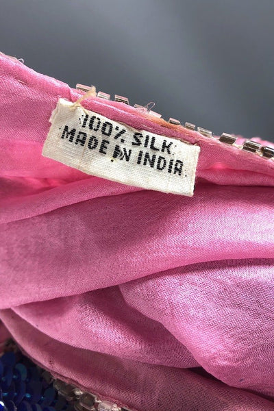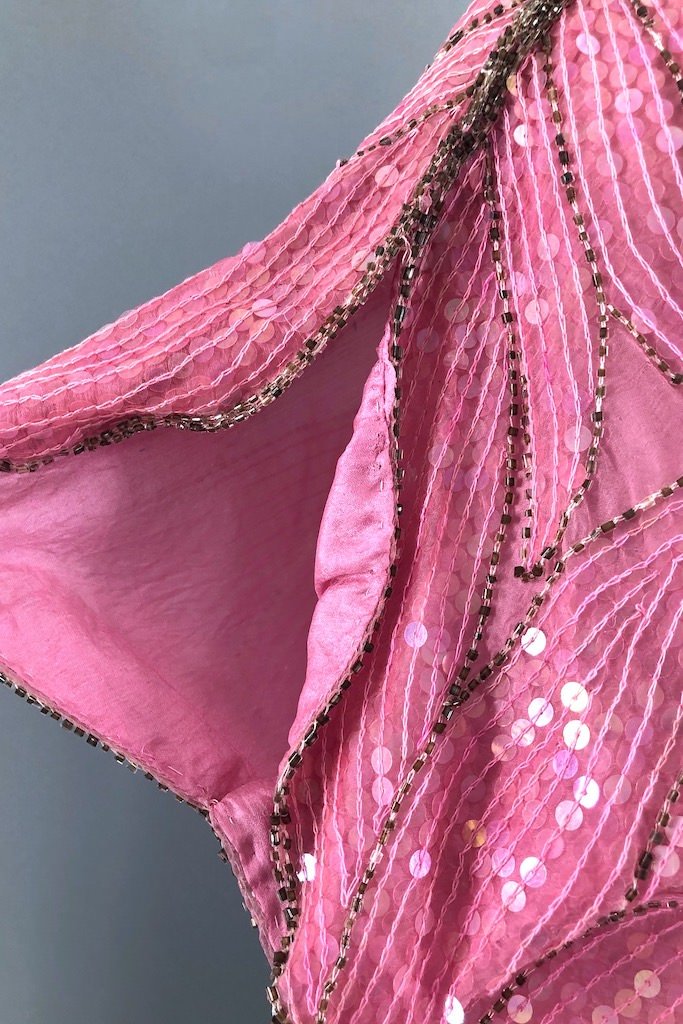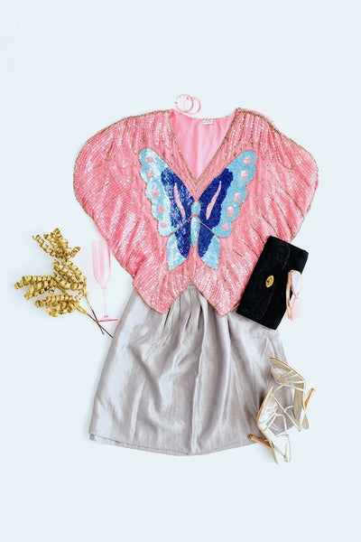 On trend for 2020, this is a vintage 1980s sequined silk butterfly top. Blue and clear sequins over pink silk. In very good condition, a few small areas of missing sequins, see last photo.