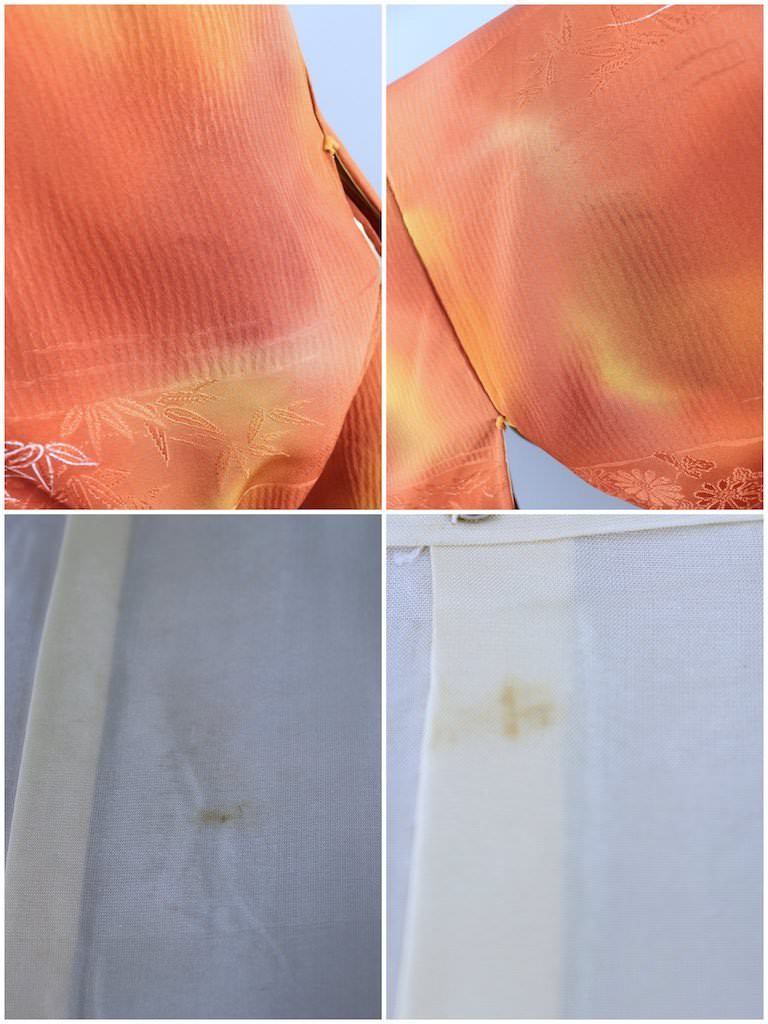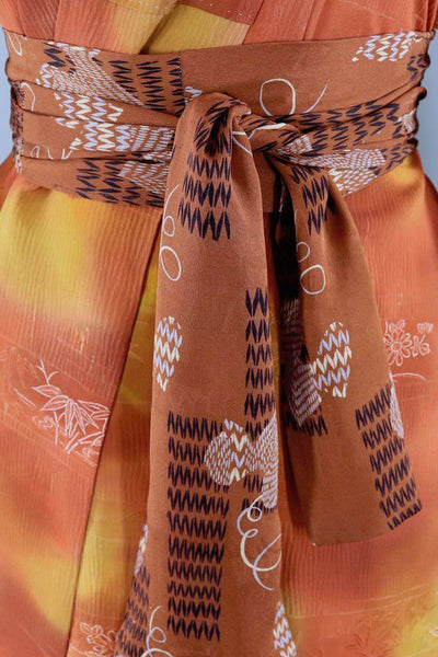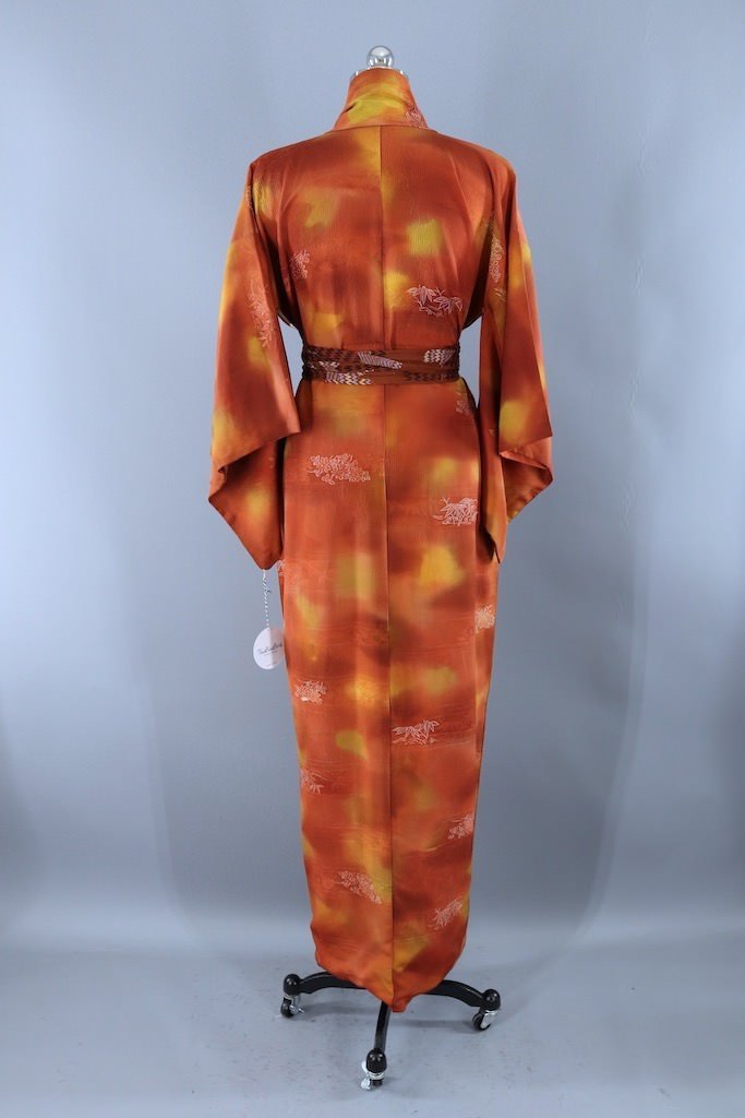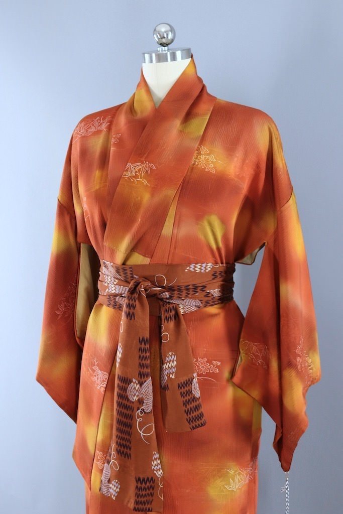 Vintage silk kimono robe from the 1960s to 1970s in rust orange and yellow ombre with a floral print. Includes a handmade sash shown in the photos. In excellent condition, just a couple small spots. See the last photo.