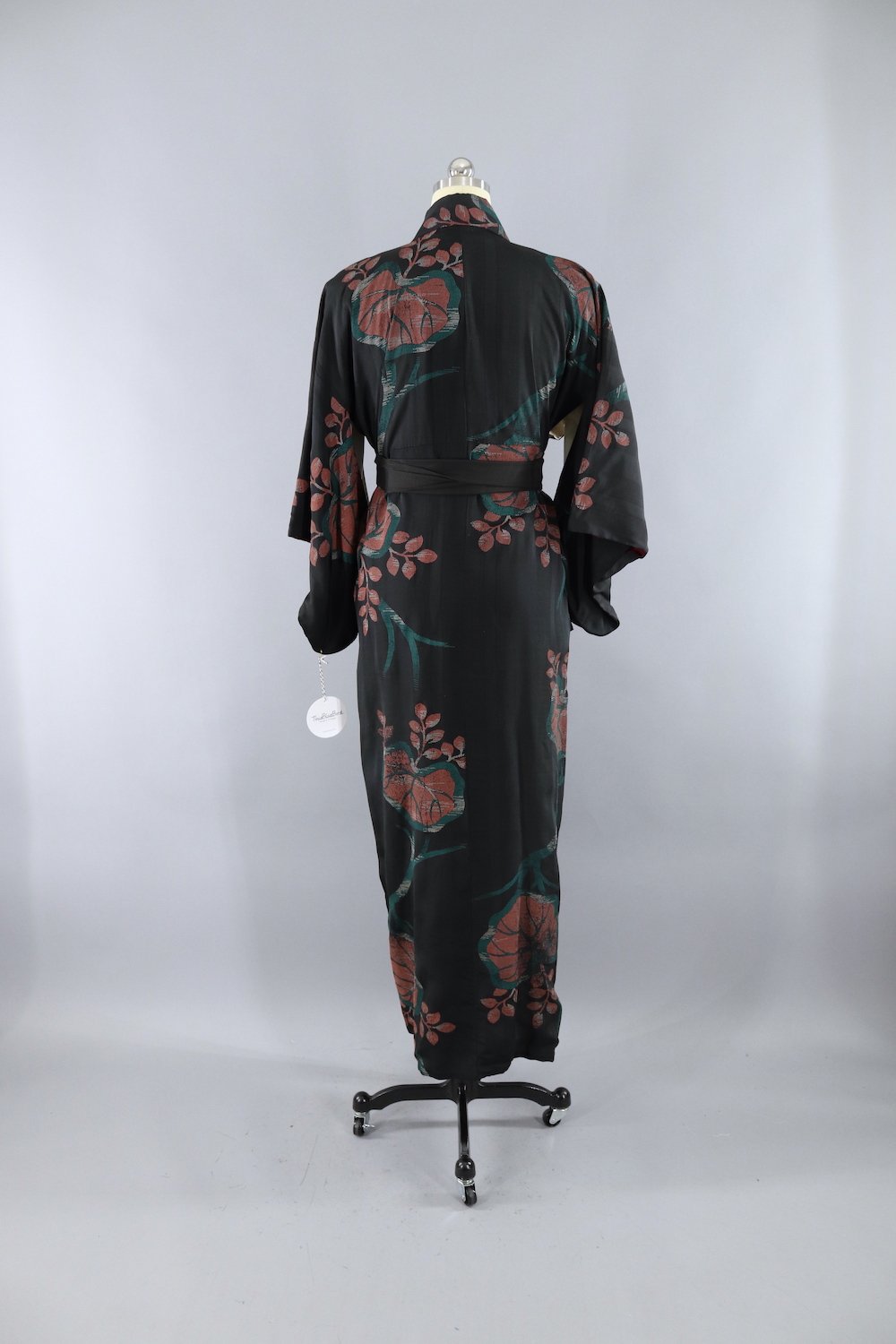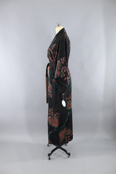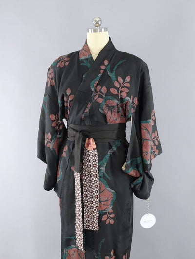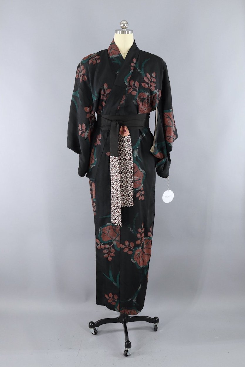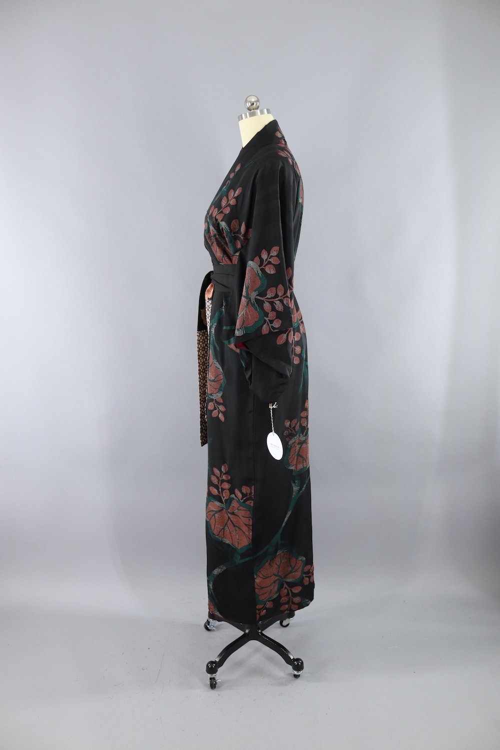 Vintage silk kimono robe from the 1940s to early 1950s in black with a dotted painted tropical leaf pattern. This is made with tiny dots of paint! It is fully lined. Includes handmade sash as shown in the photos. In good condition, it has two small holes along the collar edge, and some of the paint is wearing, a few spots on the lining, see examples in last photo.
