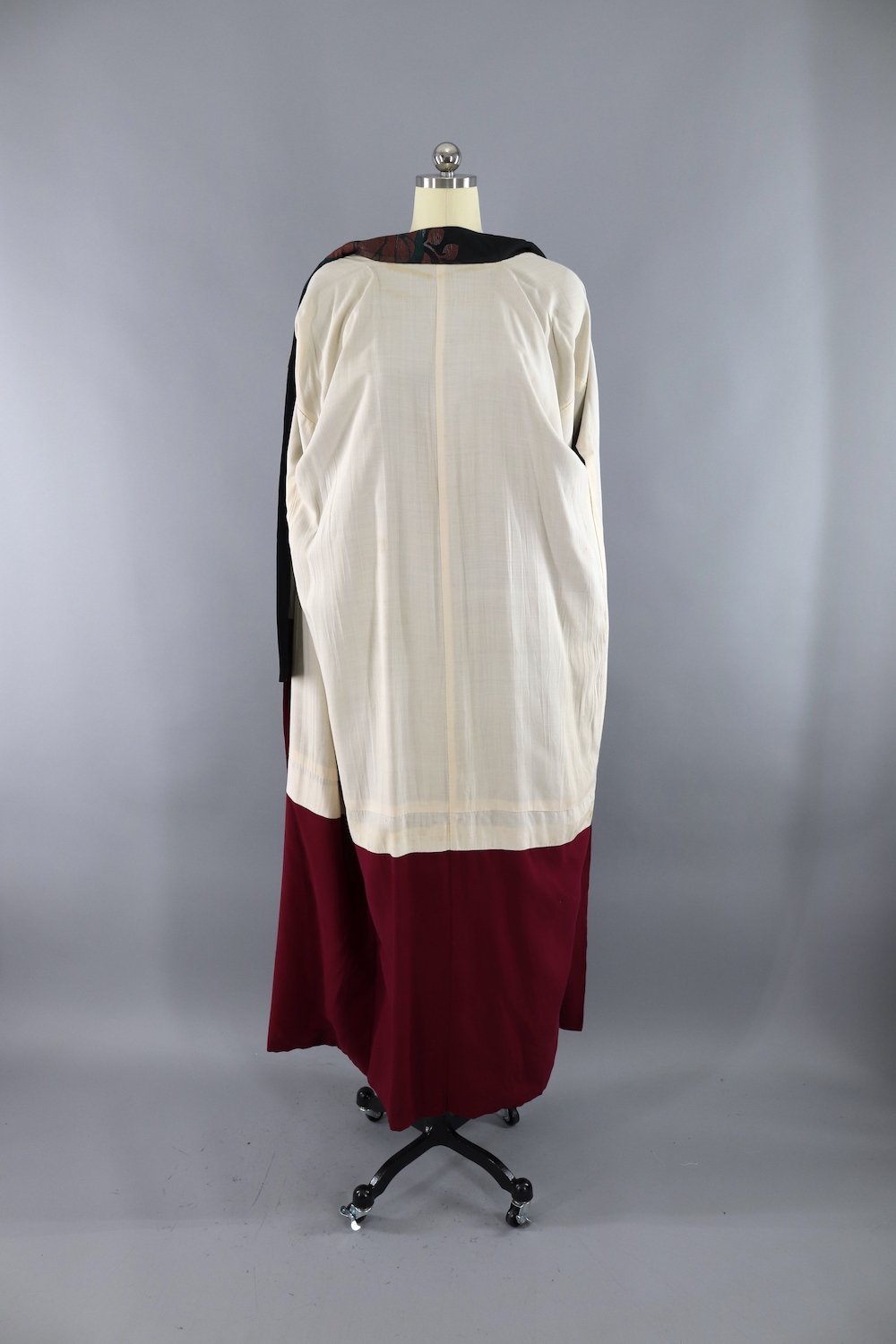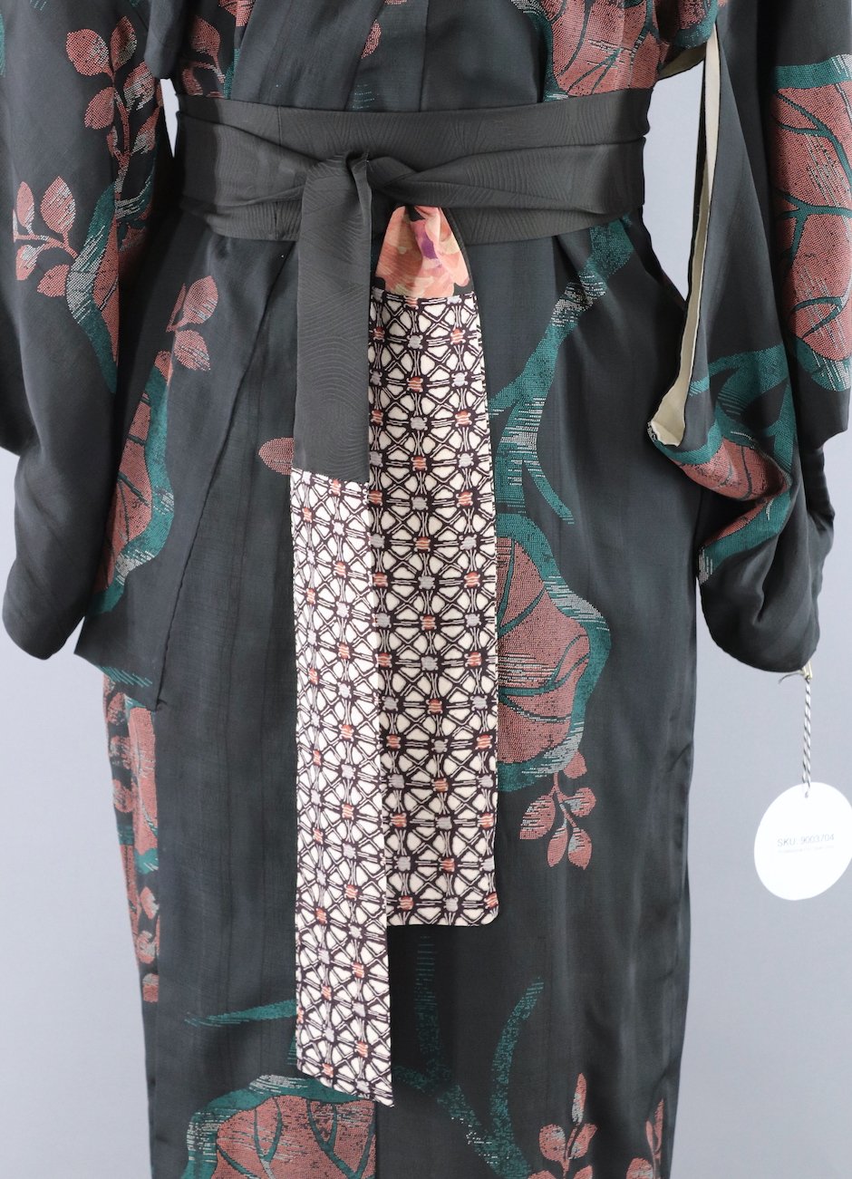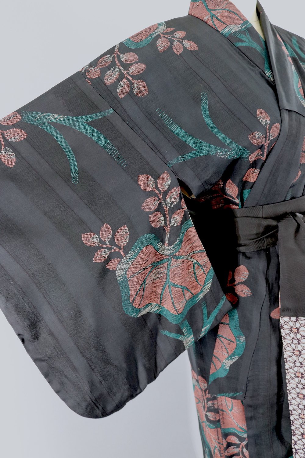 Vintage silk kimono robe from the 1940s to early 1950s in black with a dotted painted tropical leaf pattern. This is made with tiny dots of paint! It is fully lined. Includes handmade sash as shown in the photos. In good condition, it has two small holes along the collar edge, and some of the paint is wearing, a few spots on the lining, see examples in last photo.