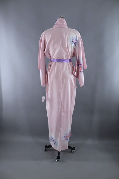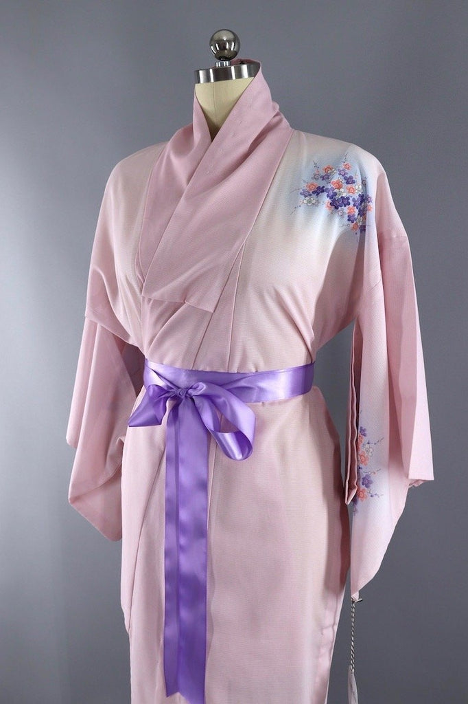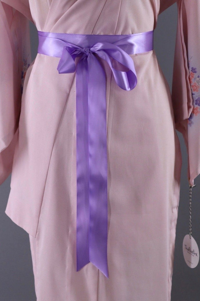 Vintage 1970s kimono robe in blush pink Ro silk with a lavender floral print. Ro silk is woven by twisting and skipping some threads, creating an open striped effect in the weave, and giving it a chiffon gauze like quality to the fabric. Not lined, it is perfect for summer weather. It comes with simple ribbon sash. It is in good condition, there are a couple light spots and two old mends, see the last photo.