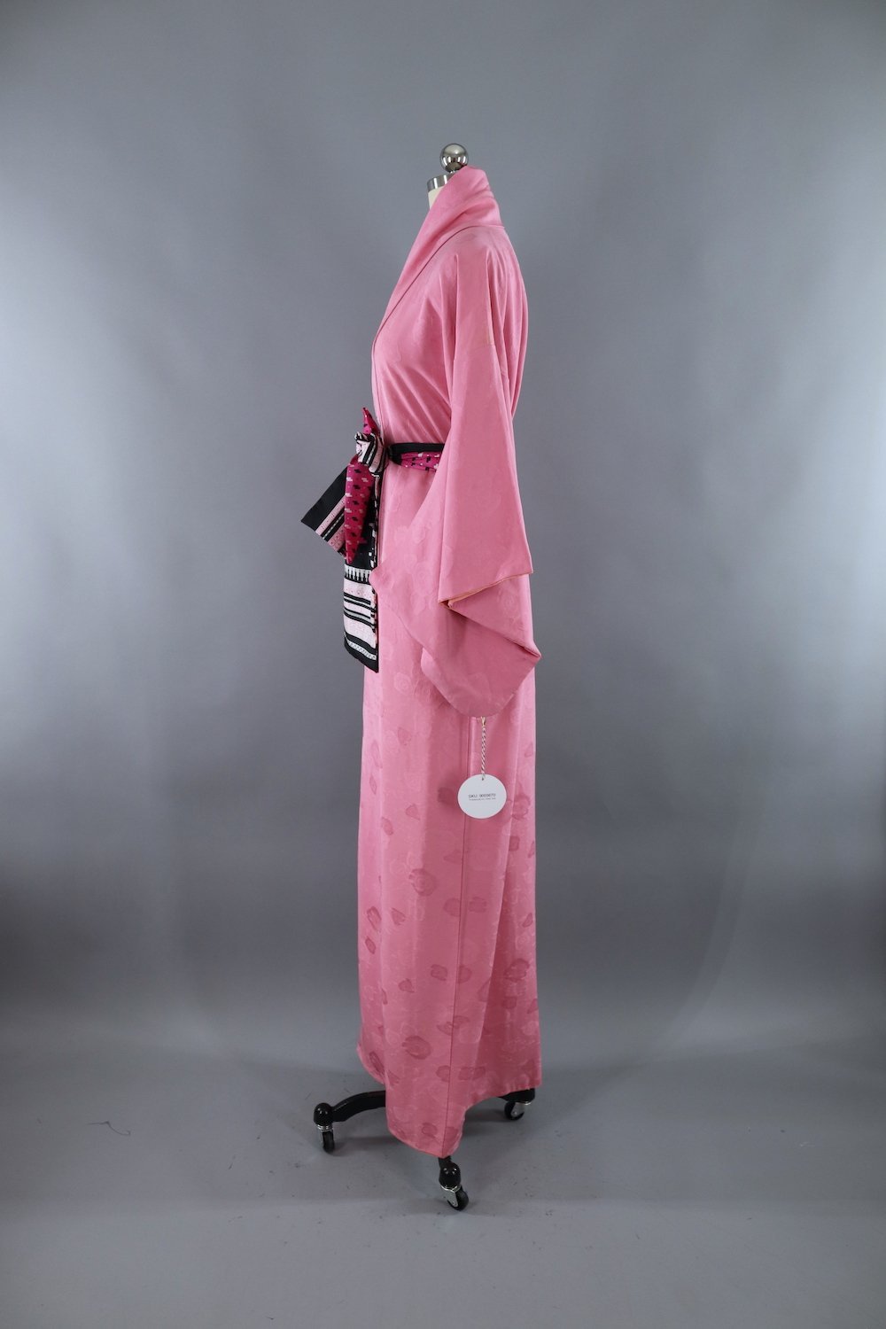 Vintage silk kimono robe from the 1950s to early 1960s in a bright pink with a textured woven floral pattern. Fully lined. Includes handmade silk sash. In very good to excellent condition. There are a couple scattered light marks on the exterior, and typical darkening to the lining fabric. See photo.