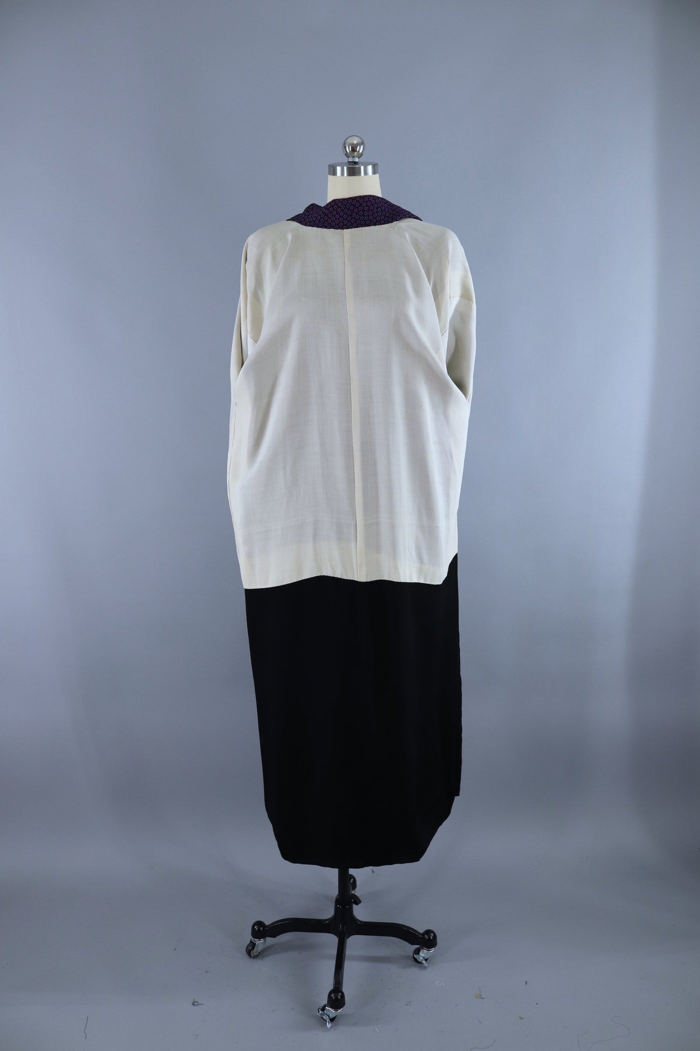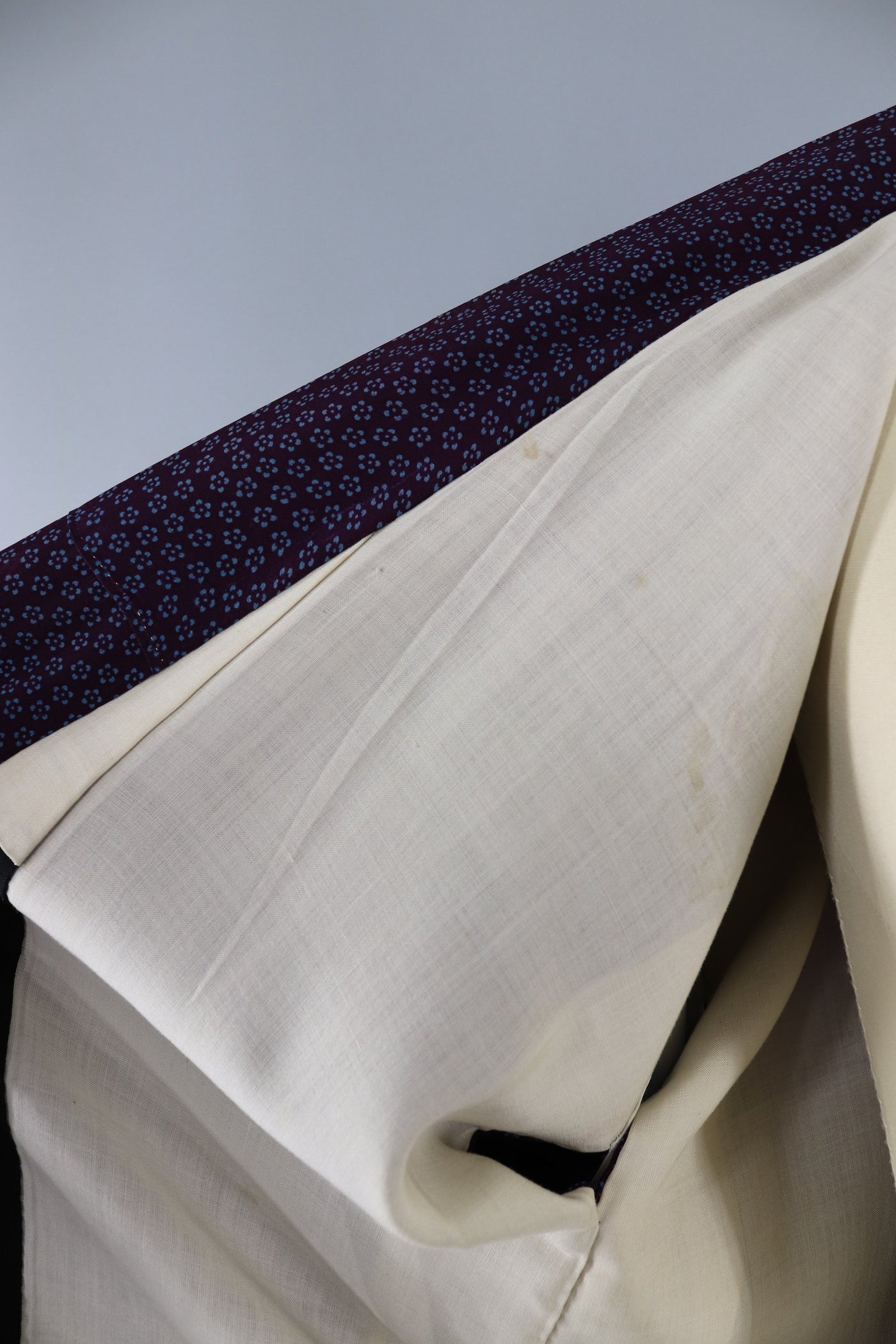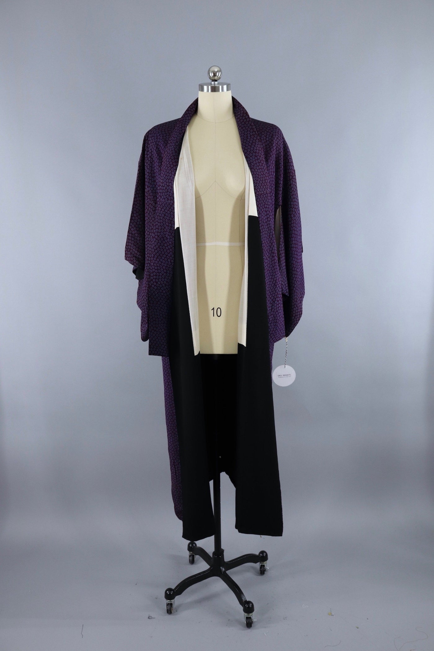 Vintage silk kimono robe from the 1950s in dark purple with a small blue floral print. Includes handmade silk sash. Fully lined. In excellent condition.