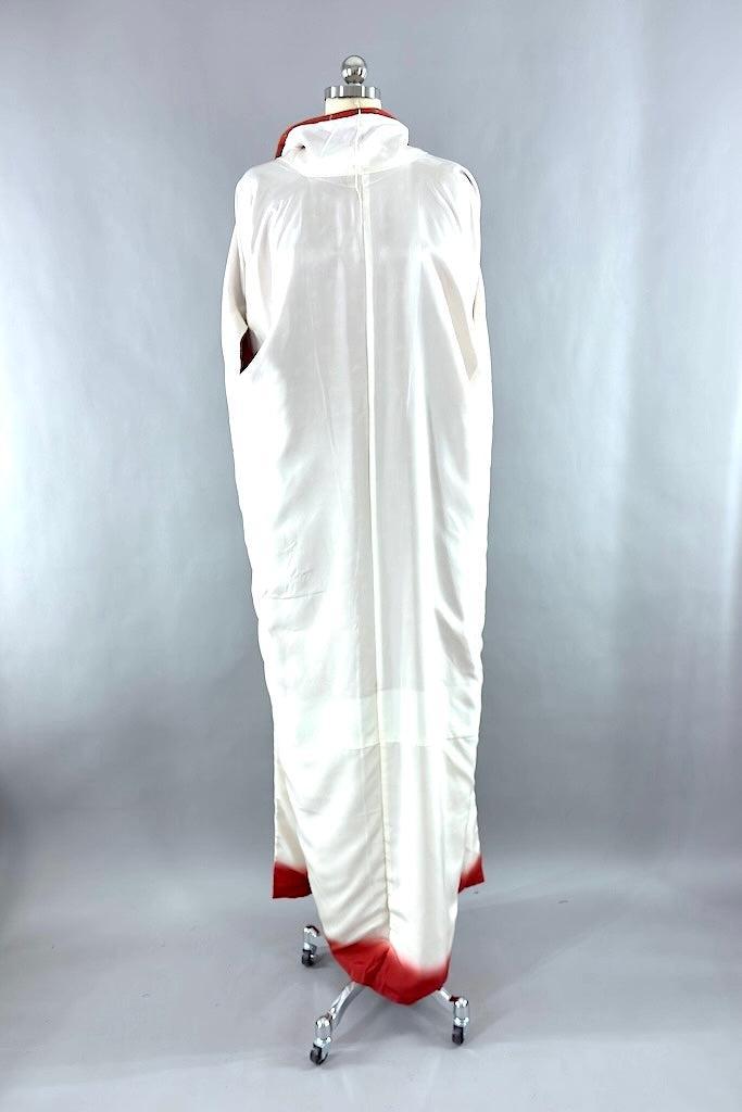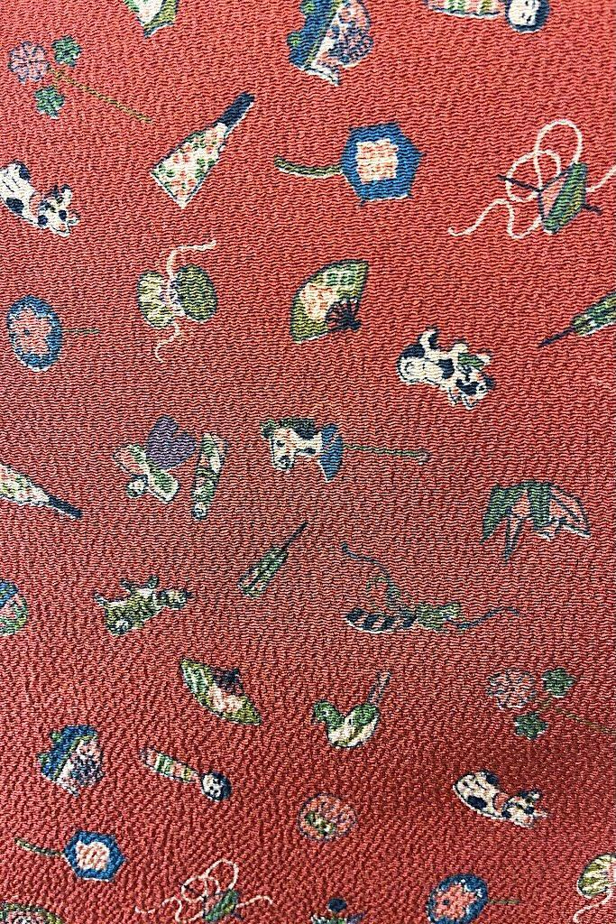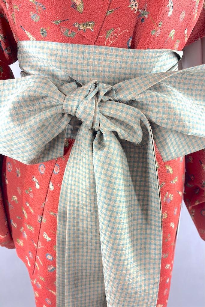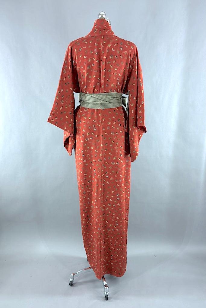 Vintage silk crepe kimono in terra cotta with a tiny adorable toy print. Lovely drapey feel to this silk. Fully lined. Includes handmade silk sash. In excellent condition.