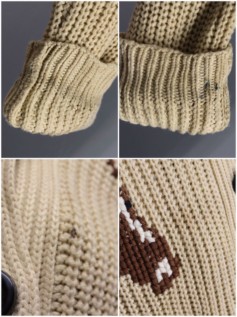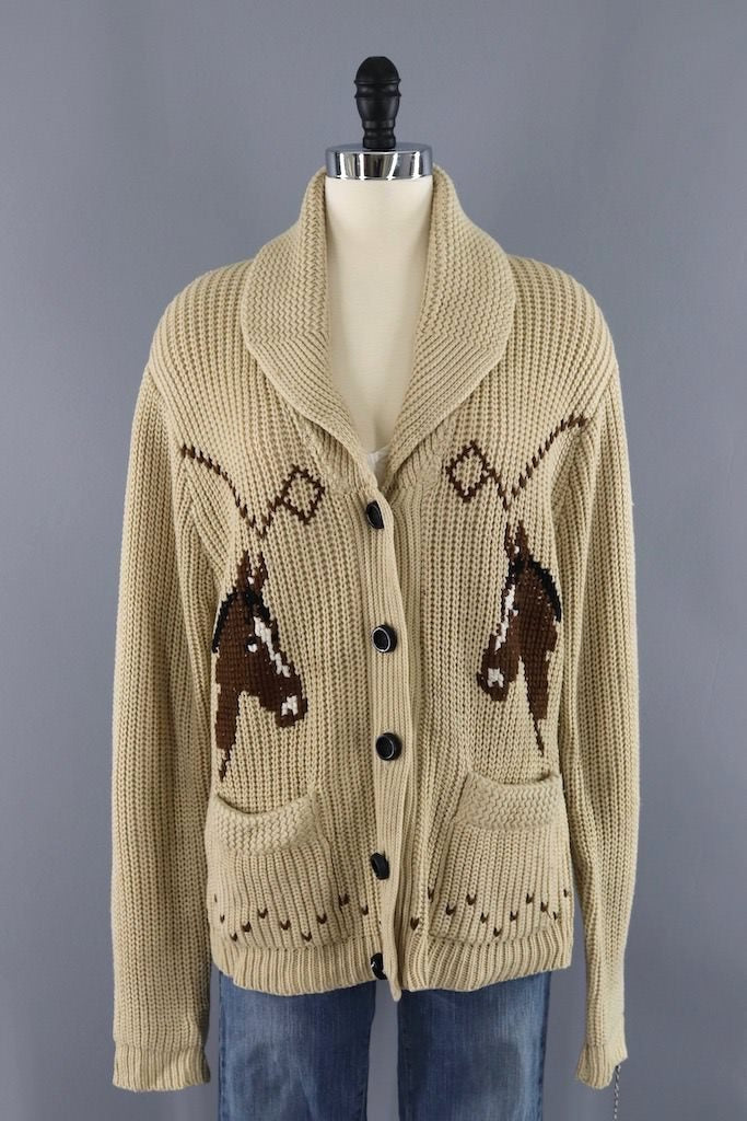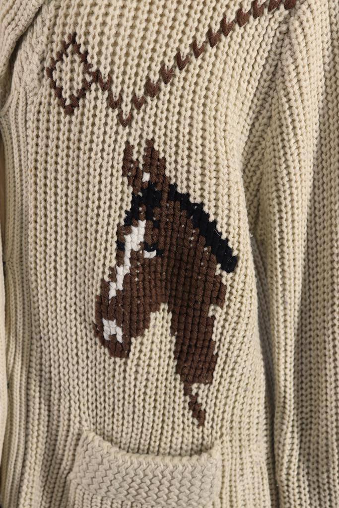 Vintage Cowichan style cardigan sweater from the 1970s with novelty western knitted horse theme. Button front, shawl collar, pockets. Not lined. In very good condition, a couple spots on the exterior, and underneath the cuffs only visible if they are turned back. See last photo.