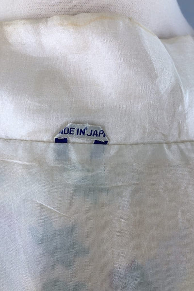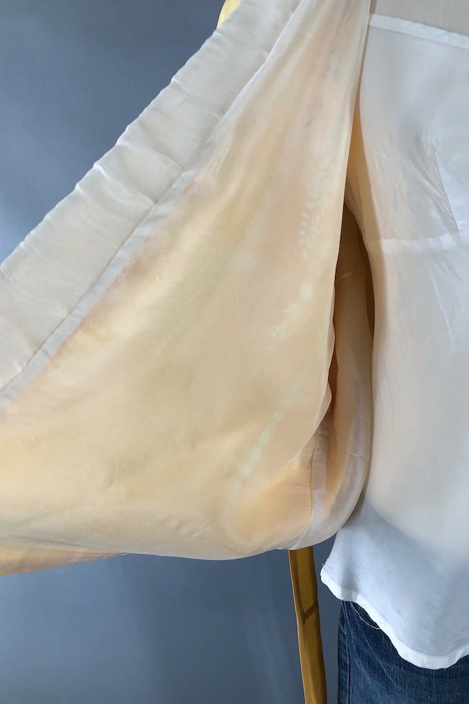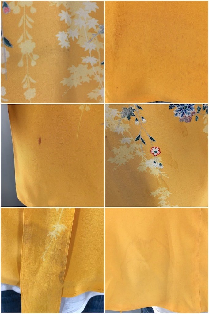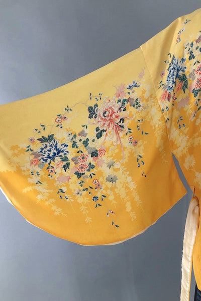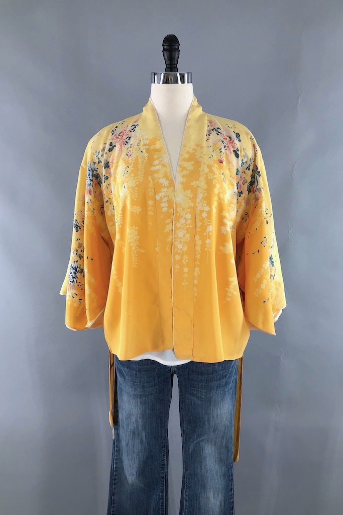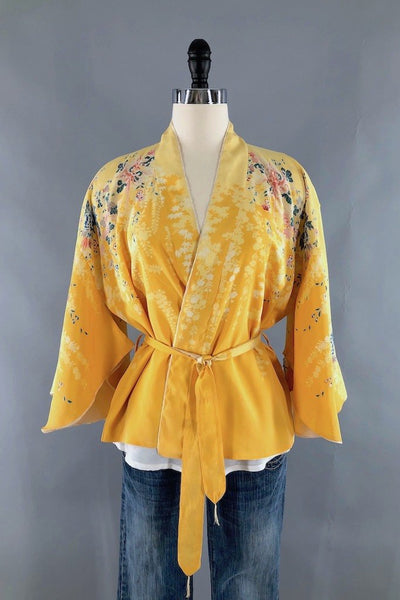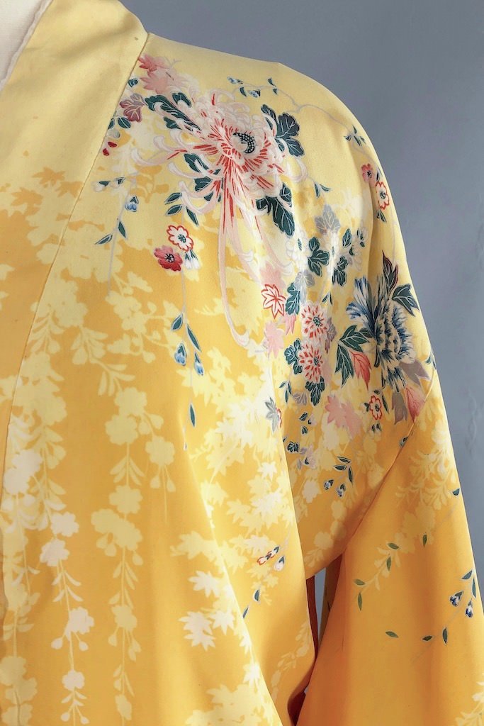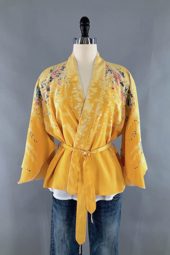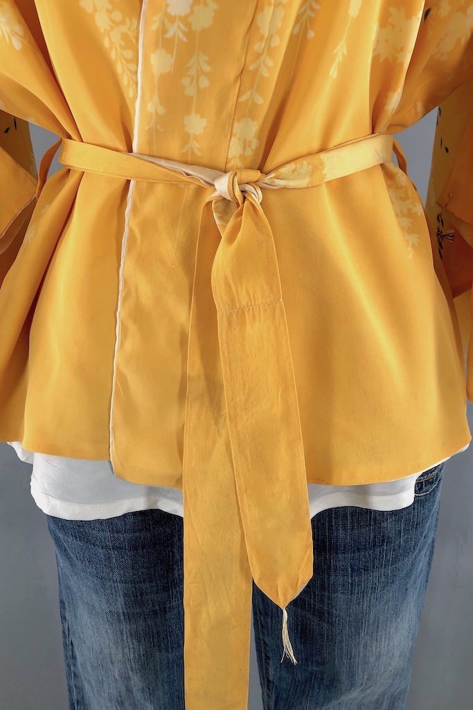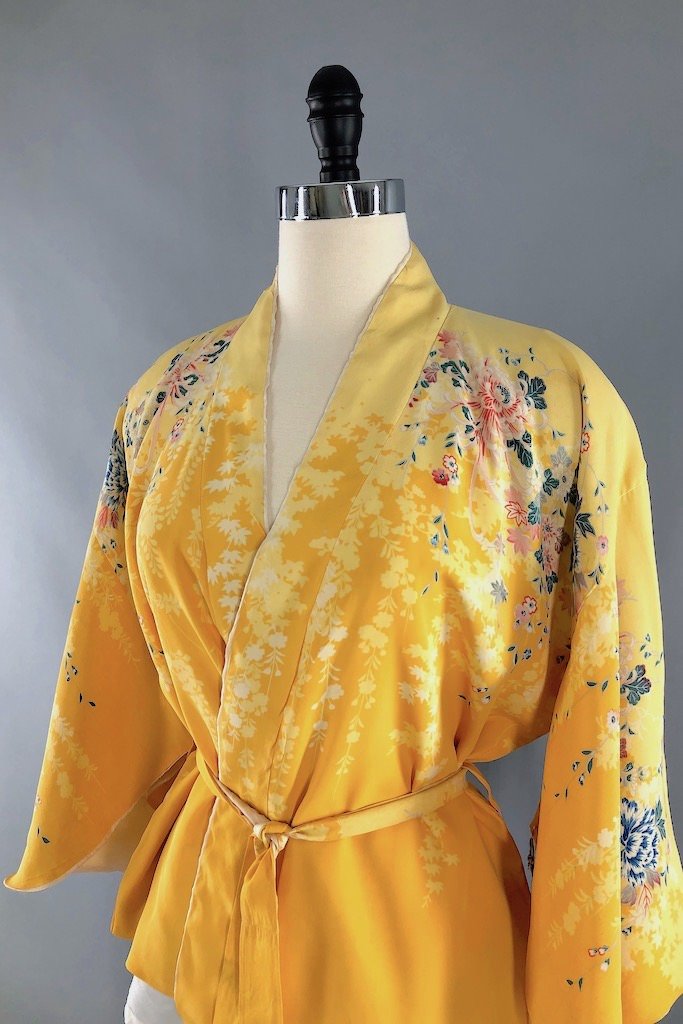 Vintage short 1950s kimono jacket with yellow and pink floral print. Made of rayon and fully lined. Includes matching tie. In good condition, but has scattered faint watermarks and tiny spots. See last photo. Sold as is.